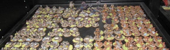 Click on the image to get a bigger version. This is a quick snap (with flash) into the miniature cabinet where the Iron Warrior and Iron Cult tray is full the to the rim. The only missing models are two Hell Talon bombers and two objectives. And there is barely enough room for those…