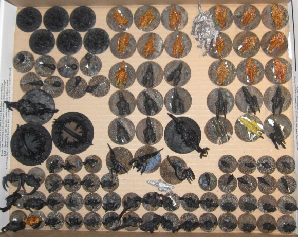 The small stuff one the bottom row are (from left) 6 Carnifex, 15 Lictors, 10 Tyrants, 8 Zoanthropes and 8 Raveners. Mixed in are two Dominatrix, a Dominatrix without Queen (to become a bio titan) and three bio titans (not pictured). With Tyranids I am never sure if the ratios between model types are “right” but there should be enough of everything for decent games.
