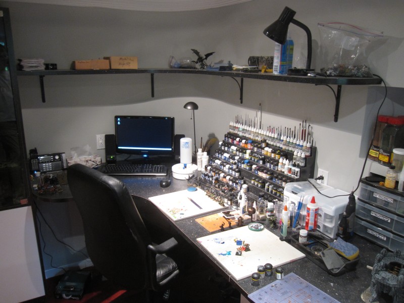 Paint station with PC (since upgraded to a 30″ monitor), paint rack, project storage on top shelf and painting area.
