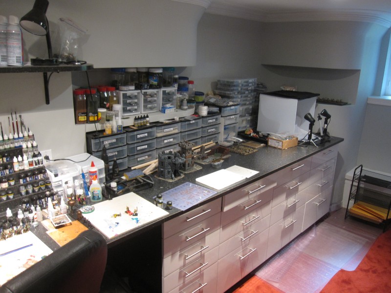 View of south wall with work area. Paint station on the left, terrain station in the middle and photo station on the right. Flames of War game in progress on central table.