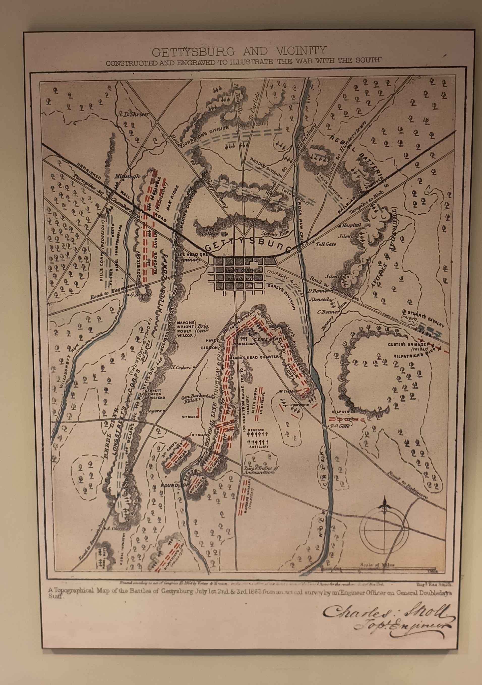 Gettysburg map (40″x28″, framed rear area is 36″x24″ grass fields).