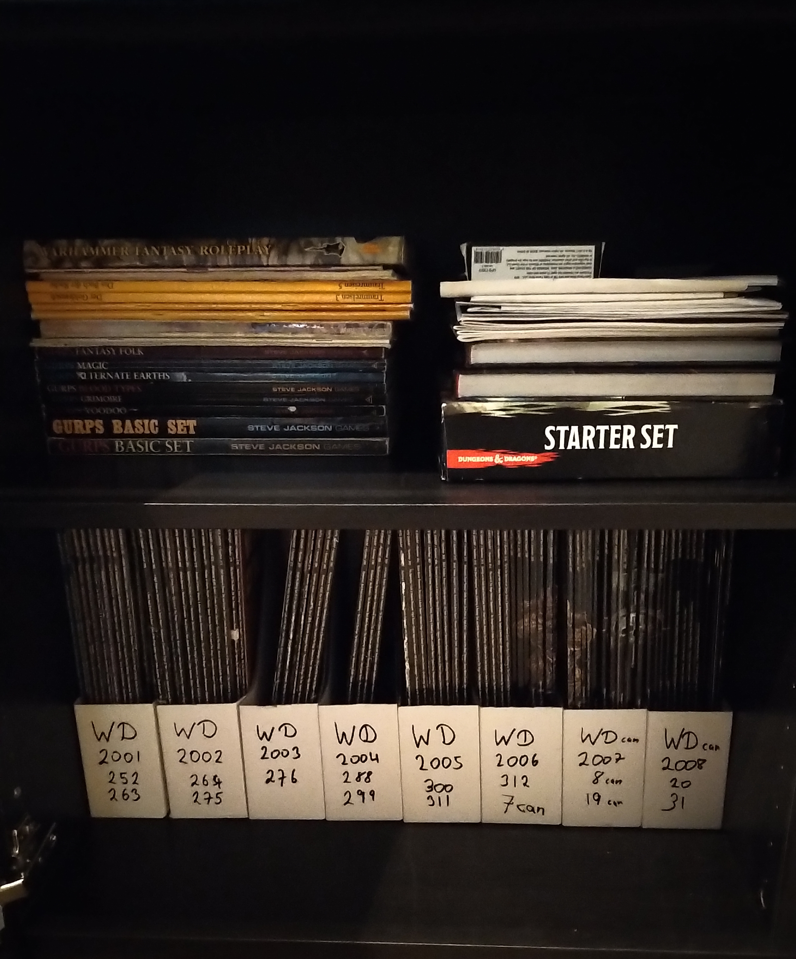 The room has a long cabinet with 18′ feet of glass cabinets. Each holds 6 shelves of 24″x14″ and built-in lighting. The bottom section of each cabinet hold various rulebooks, game boxes, and my collection of Wargames Illustrated and White Dwarf magazines.