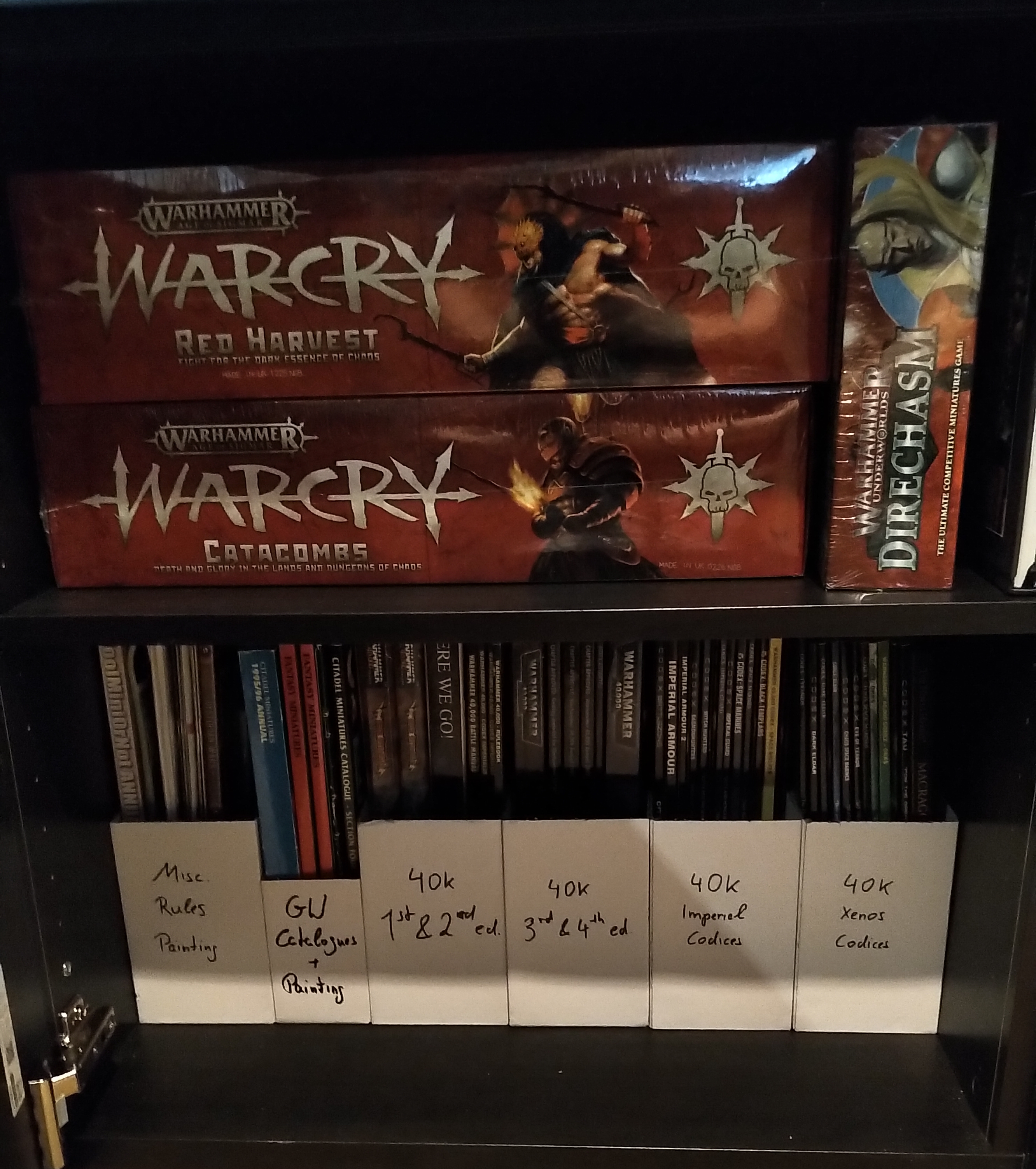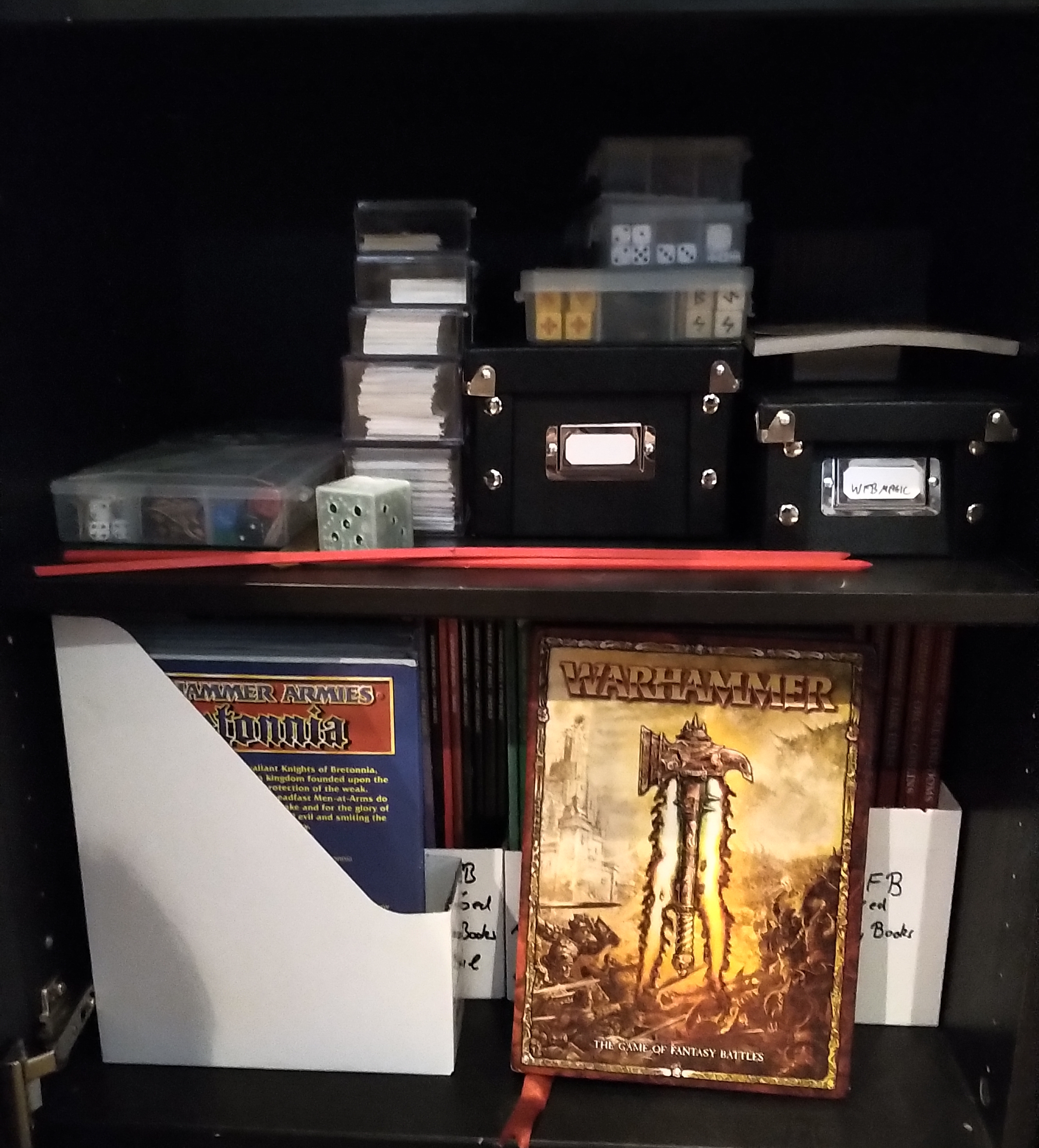 Example of side cabinet skirmish section (From Top: Blood Bowl, Mordheim, DBA & Lord of the Rings, DBA, Battlefleet Gothic).