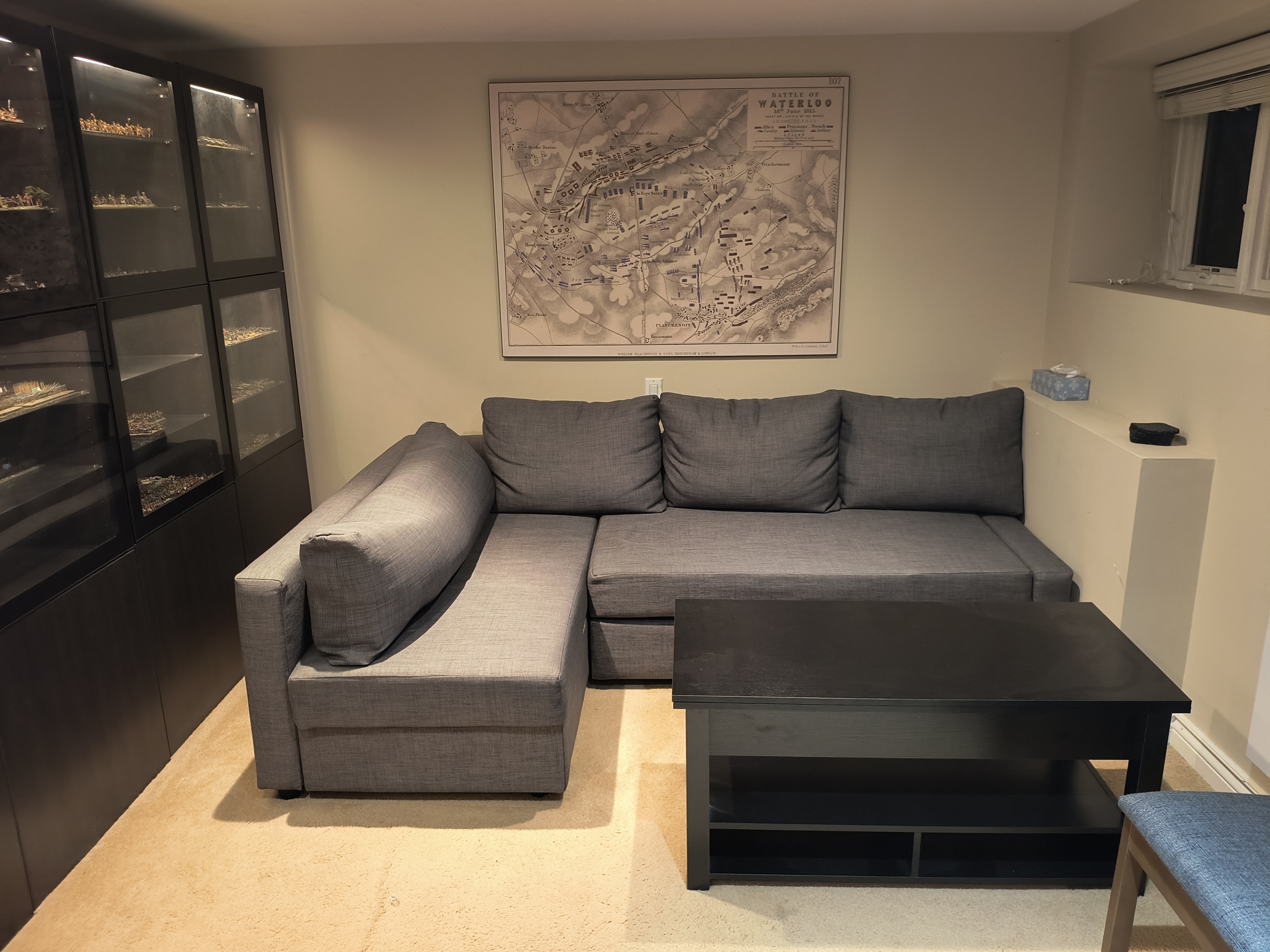 I had the opportunity to design and built a wargaming room from scratch. This page gives an overview of the design intent and the final result. Since this room was built, I have expanded my “gaming realm” to a few neighbouring rooms which are briefly described at the end.