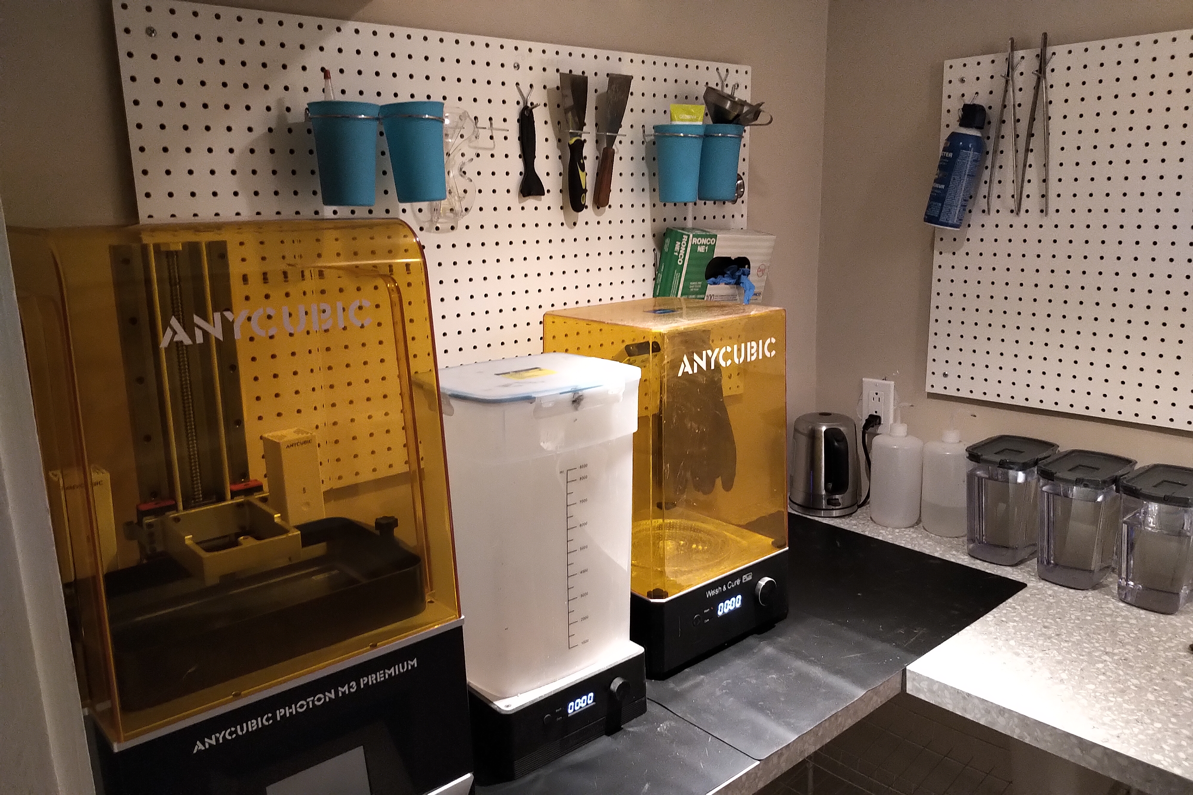 Like many, I jumped into the 3D printing hobby shortly after my original room was ready. Printing requires a separate, enclosed, temperature controlled, and well ventilated space, so that’s yet another room! I set up a print station for resin and another for FDM printing. The rest of the room holds a large shelf space for long term project storage.