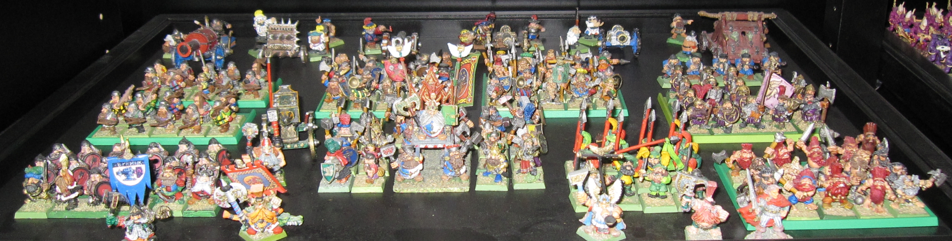 While taking pictures of Epic models I had to open some of the less frequently visited cabinet doors. This one is a blast from the past: A very old Dwarf army. They don’t make them like this anymore… sniff. I have vague plans to one day dip the entire army and redo the bases. The paint job is nicely “blocked in” without highlights so a bit of dip would go a long way. On the left we have some extremely old school Rangers and two units of crossbowdwarves behind them. In the middle is mighty Thorgrimm on his throne surrounded by three units of clan warriors (armed with double handed weapons, hand weapons and spears respectively). Next to him are the famous “Swedish Pikemen” dwarves including a piper! Finally same slayers and the infamous Uther’s Dragon Company in imperial purple. Oh, and all the old heroes and warmachines. Apart from the spears this might actually be a playable Dwarf list today…