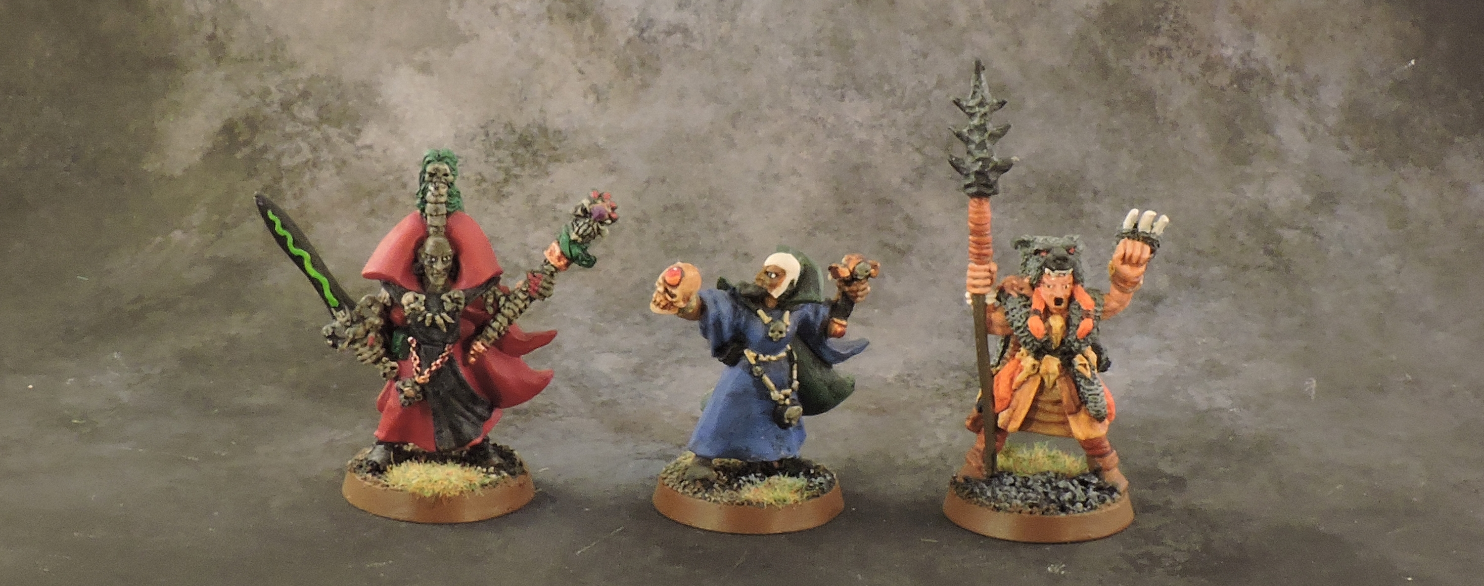 Wizards: The necromancer, exorcist and hedge wizard (from the left) provide different types of magical support to those who desire it. The figures are all from the Warhammer range. The hedge wizard in the middle was originally an Empire Amber Wizard and was one of my first painted Warhammer figures. His age definitely shows…