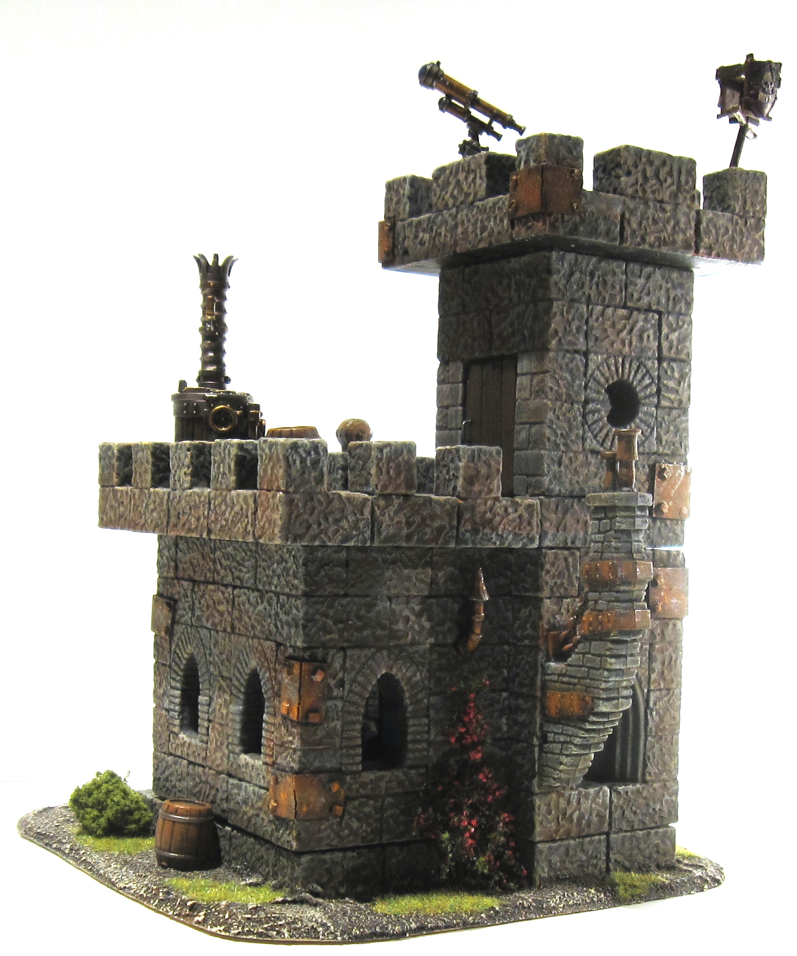 The Tower of the Mad Scientist is based on the Hirst Art Wizard Tower design. I modified it a bit with various pieces of Warhammer and Platformer parts. The doors are fully hinged and the top comes off for interior access. Like all buildings, the top is held on by magnets embedded in the UltraCal blocks.