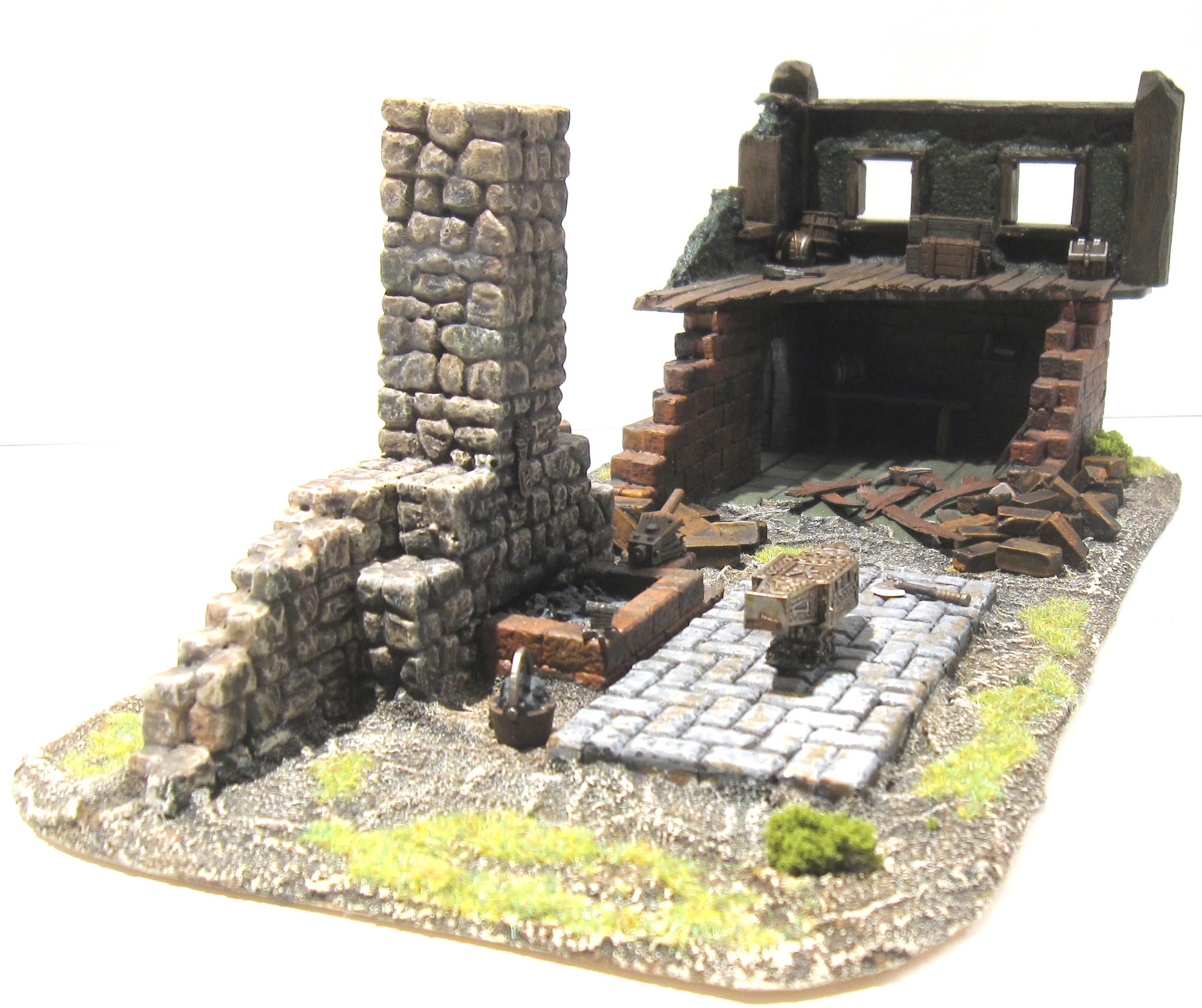 The Smithy is the workplace that uses to support the Thorgrim’s Dwarven Steel store on the Market place (above). At least that’s the theme I was trying to carry across. The piece is a mix of brick, fieldstone and plaster construction with some Warhammer bitz thrown in for detail. The detailing matches the Weapons Shoppe so hopefully that creates the visual connection.
