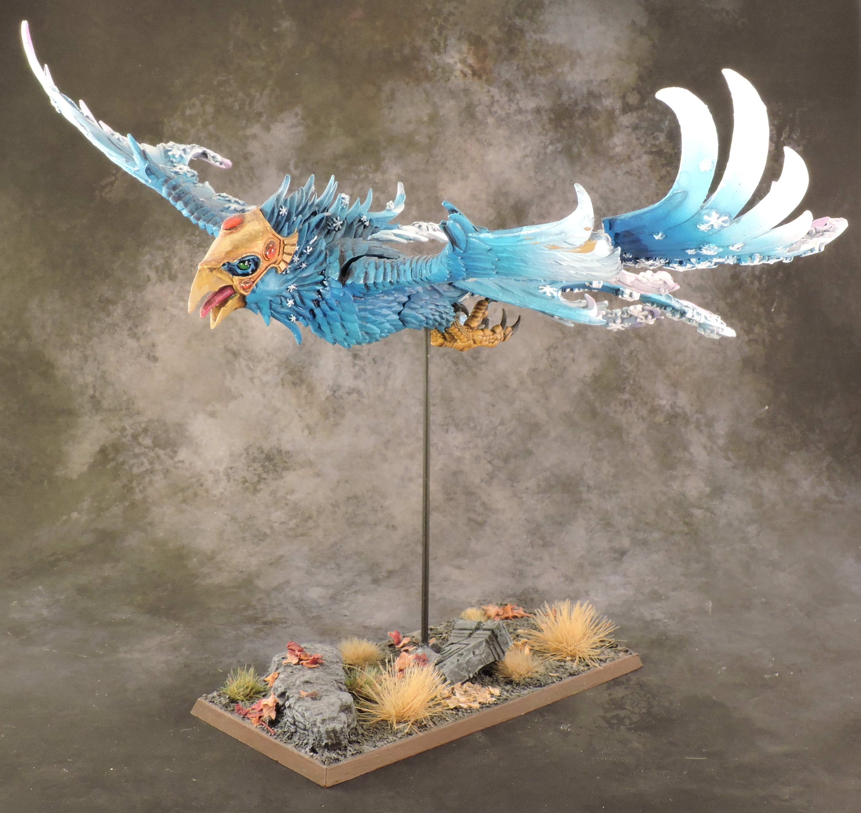 The High Elves can call upon some of the mightiest monsters. The Dragon above is magnetized to be fielded without a rider if that’s desired. The next monster is a Frostheart Phoenix which was another airbrush experiment. The top crest is magnetized and can be swapped for a rider. I decided to give the Flamespyre Phoenix a pass because the red flames just really didn’t fit into the blue and white High Elf army.