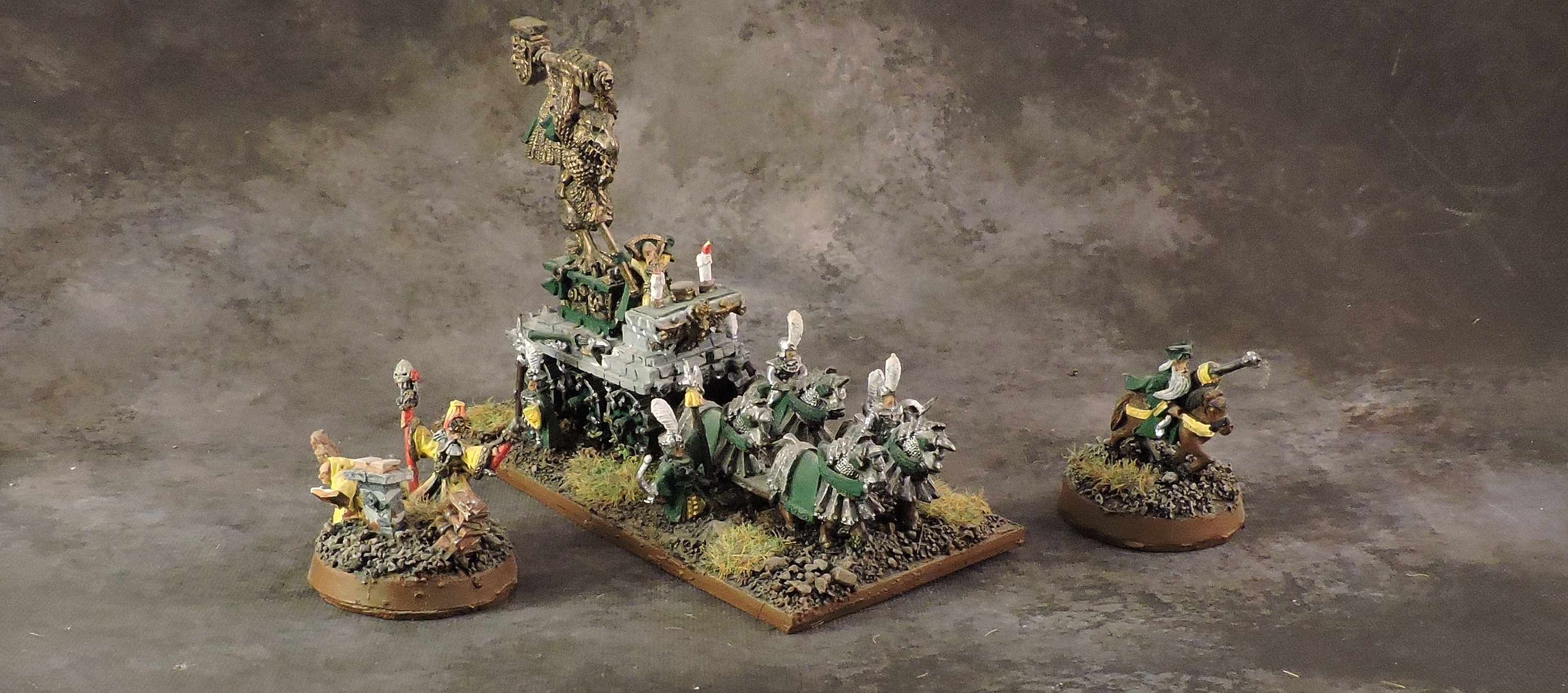 The Wizard contingent is led by a Theogenist on a mighty War Altar. I used a custom cut 80mm by 40mm base to provide room for a few foot guards and add stability to the model.