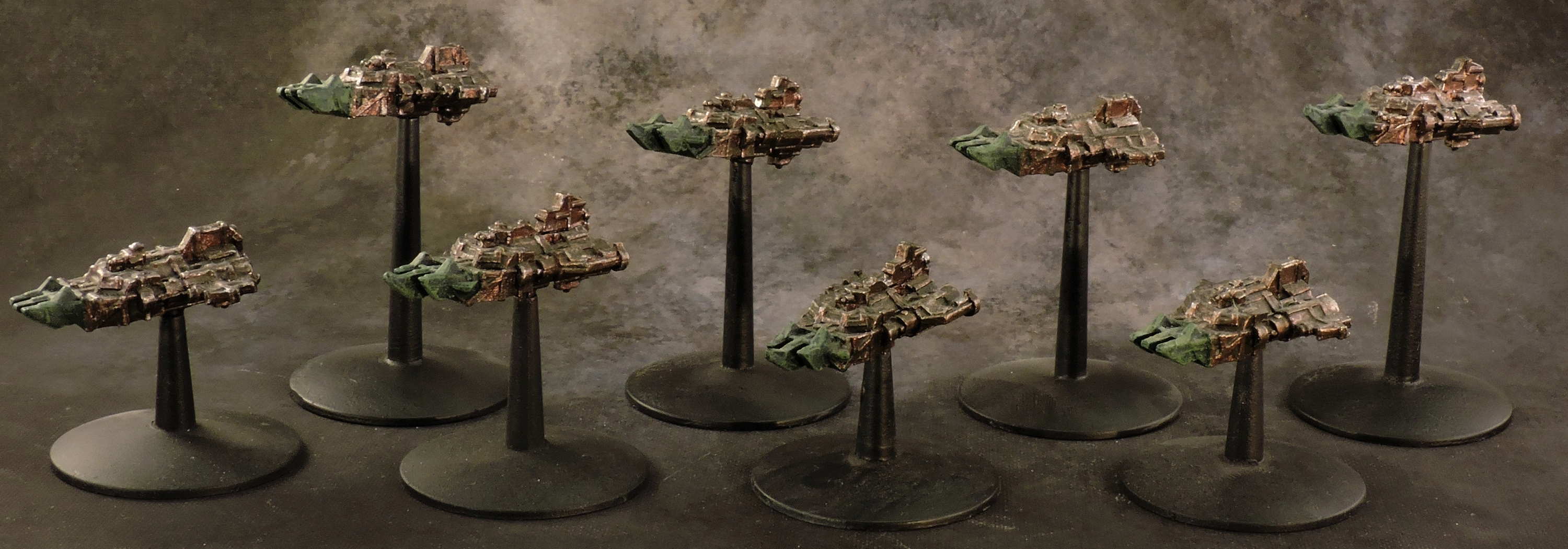 The Ork fleet is big and non-too subtle. With large formations of all available escort types it can literally swarm enemy fleets. The paint scheme is a simple three-colour metal drybrush with green “heads”. This helps to tie the entire fleet together visually. Compared to the Imperial and Chaos fleet the Orks lack capital ships but more than make up for this with large numbers of escorts. In part this is due to the nature of Orks in Battlefleet Gothic as a raider fleet. The limited range of figures imposes further restriction as it is very frustrating to build up points with cheap escort ships. My goal is to increase the fleet’s point value by adding Roks and a scratch build capital ship but this is fairly low priority.