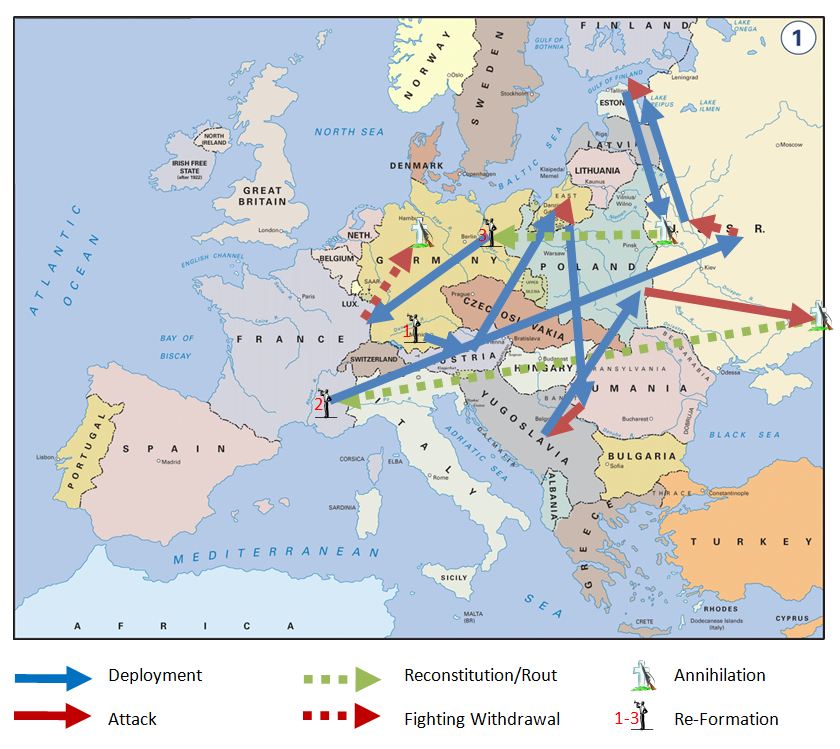 Erwin Schmidt served in the Feldherrnhalle Division and its ancestral units during the Second World War. This campaign chronicles his progression through the ranks of the division as well as the service history of the unit. Major strategic movements of Feldherrnhalle are indicated by the unit symbol in an eight-sided green star. The campaign is divided into five chapters which cover the major phases of operations for Feldherrnhalle. The tragedy and insanity of war cannot be highlighted more than by the fact that over half of the chapters end with the complete annihilation of the division.