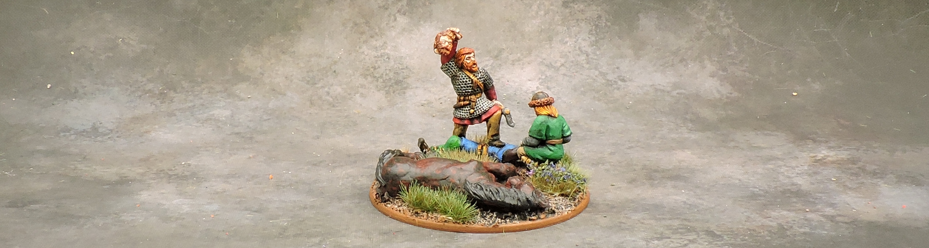The Vikings are the quintessential Dark Ages faction. The SAGA game system focused on a more historically correct view of the Scandinavian Vikings – no horned helmets here – so I tried to stick with a more natural colour scheme. My collection allows for play as Vikings, Jomsvikings, or Anglo-Danes in the SAGA system. The figures are a mix of Gripping Beast, Warlord Games, and assorted conversion bits thrown in.