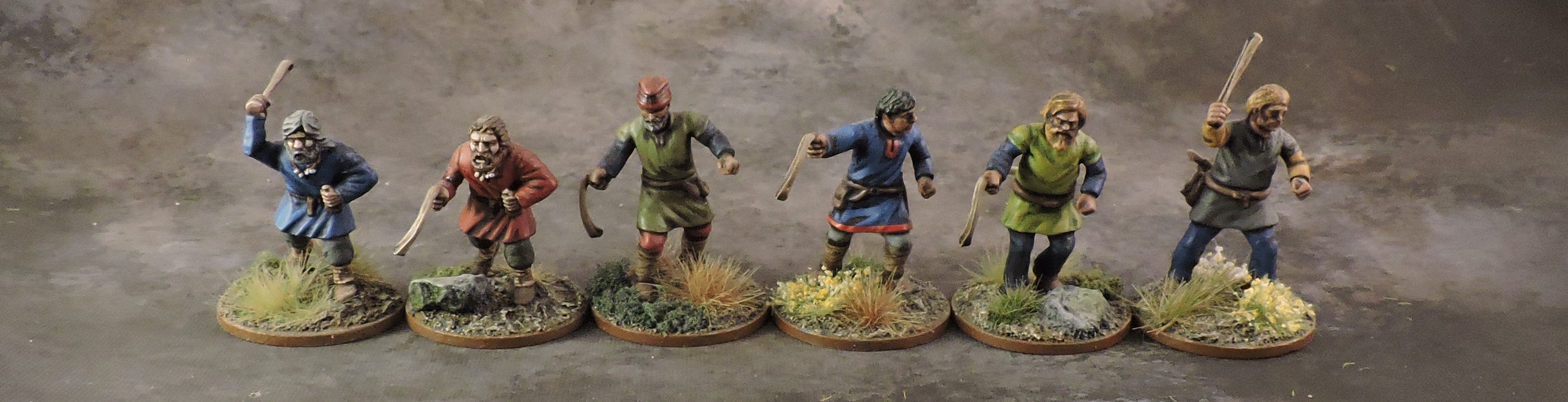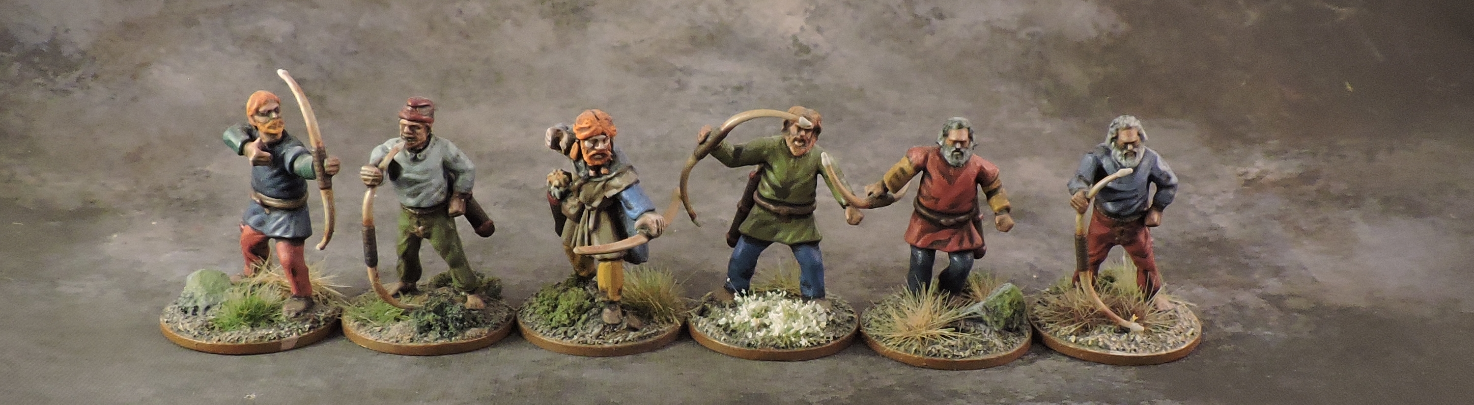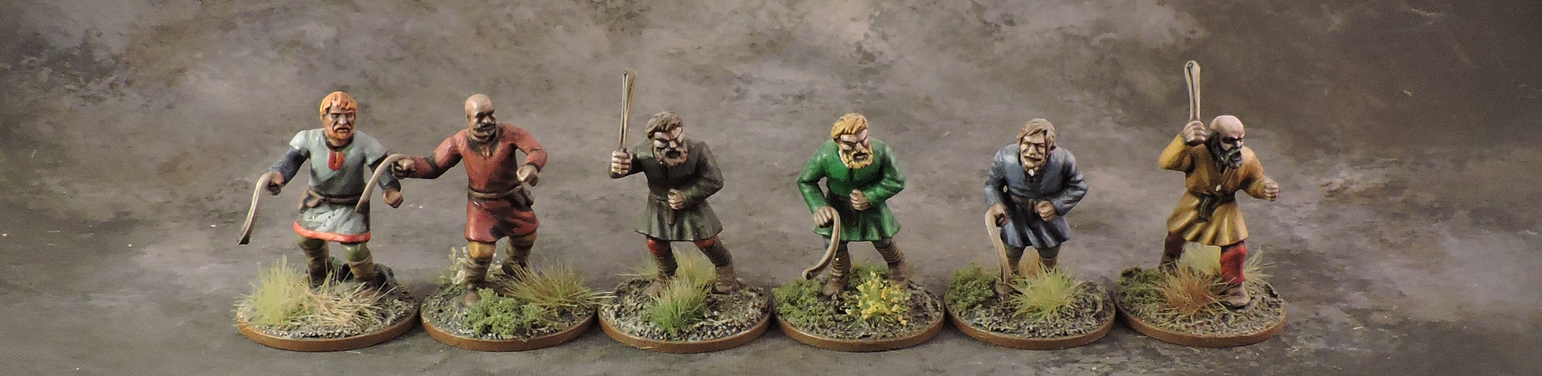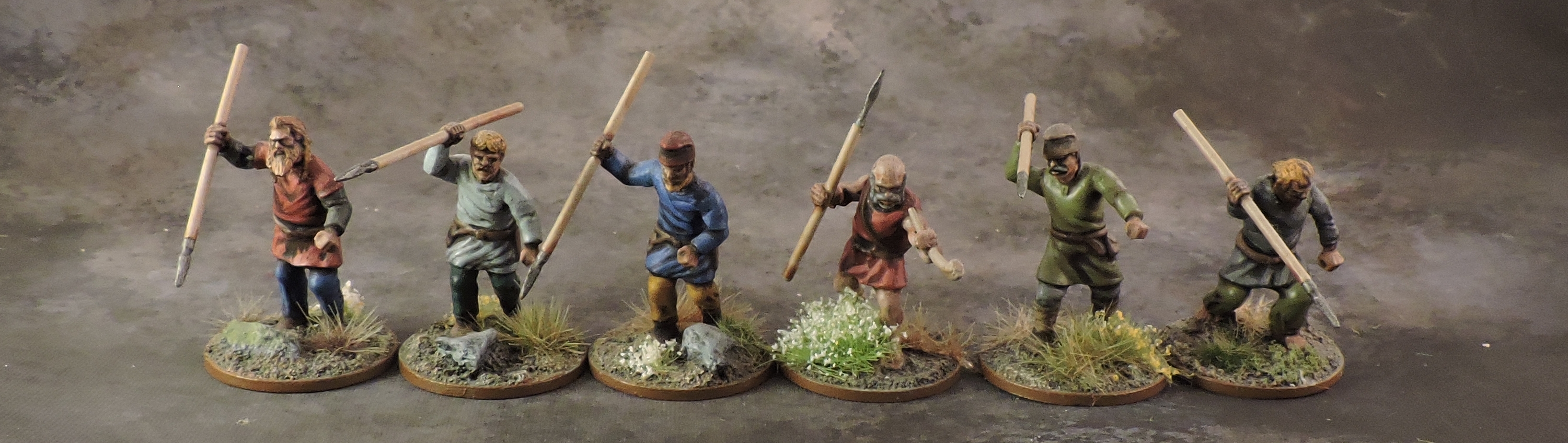 As much as I try to personalize each SAGA force – instead of just using the same generic warriors for all warbands – I draw the line at levies. Poorly trained peasants should pretty much look the same regardless of whether they be Saxon, Danes or any other of the cultures of the British Isles. Thus, I made a generic levy version of all the typical options: two units with javelins, two units of slingers, two units of bows. Probably overkill but hey, painting hundreds of figures for a Dark Age skirmish game is overkill in the first place. The figures are a mix of plastic kits from different manufacturers as well as some metal figures for variety.