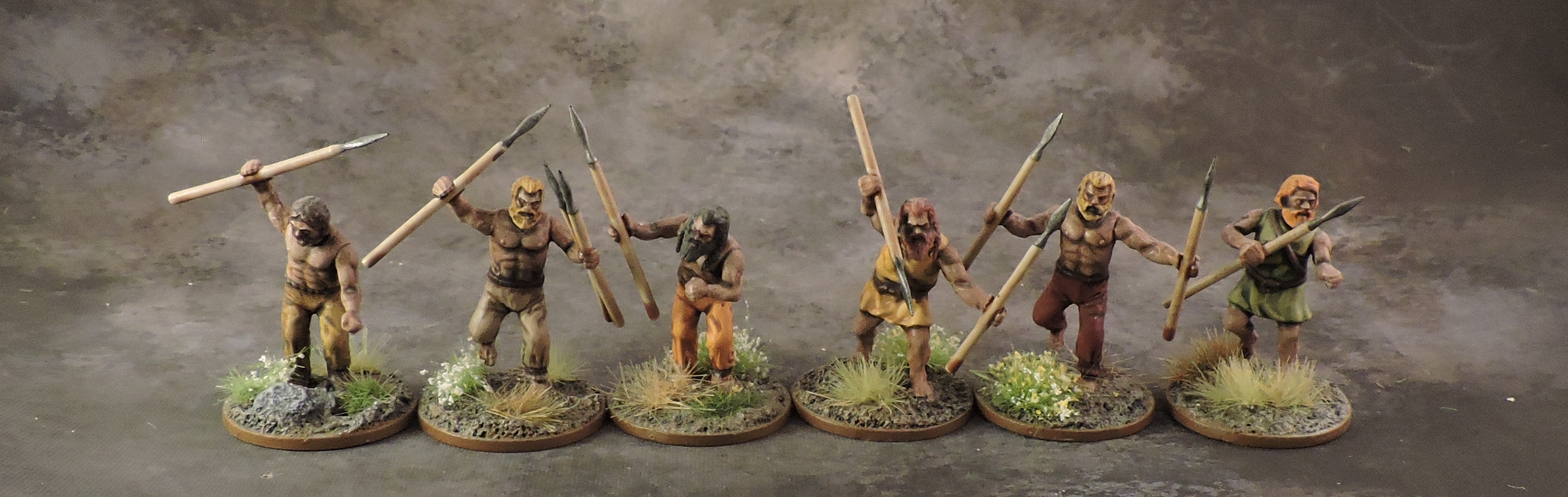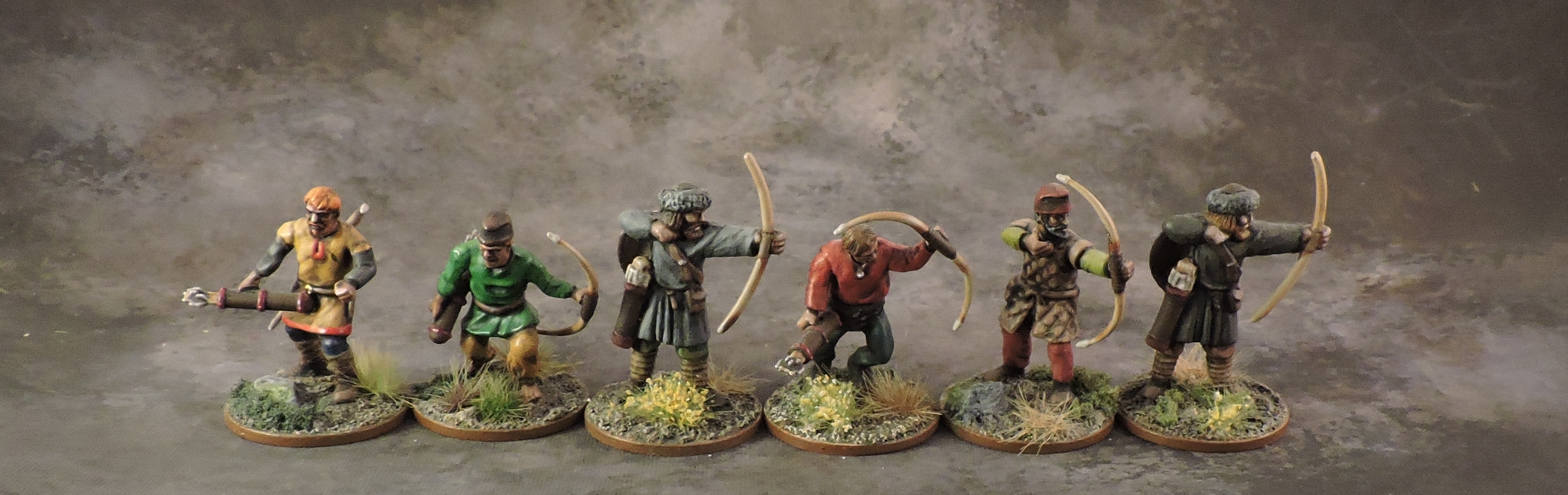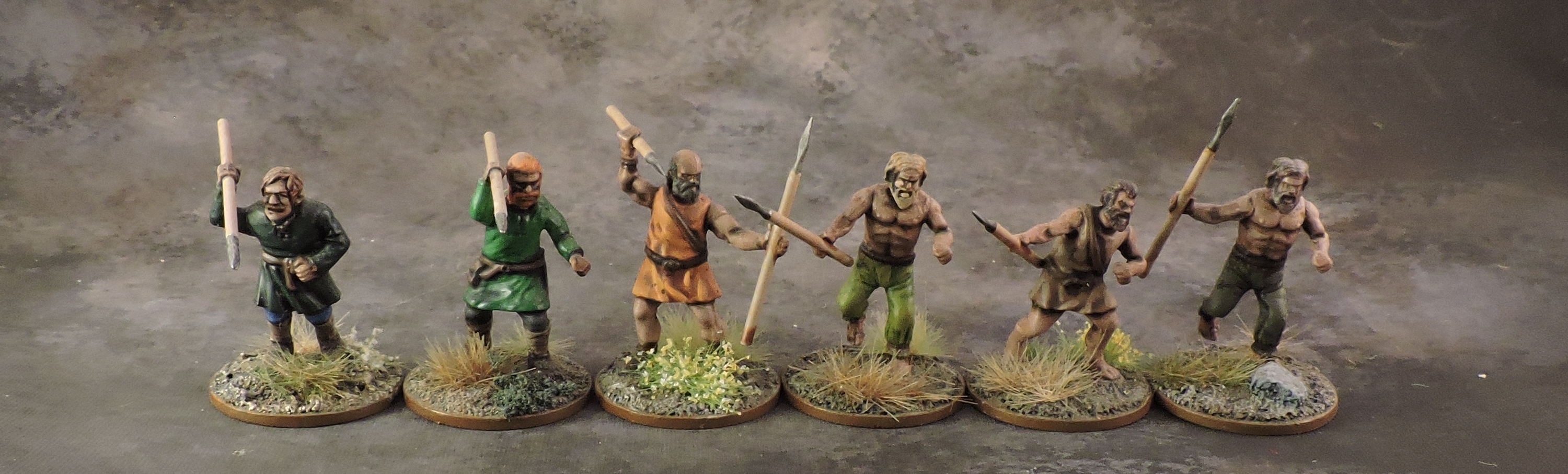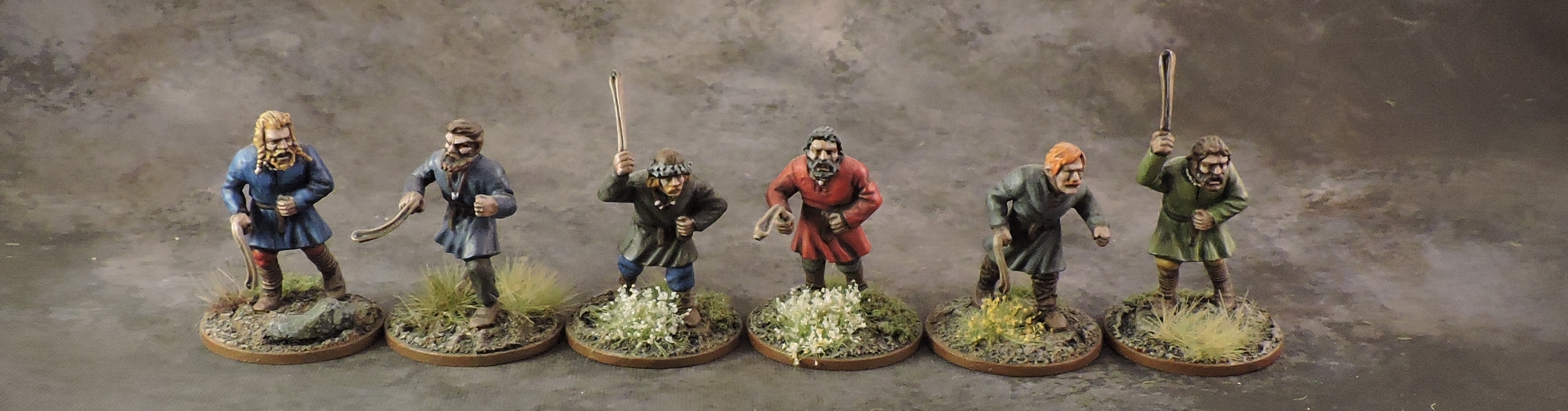 As much as I try to personalize each SAGA force – instead of just using the same generic warriors for all warbands – I draw the line at levies. Poorly trained peasants should pretty much look the same regardless of whether they be Saxon, Danes or any other of the cultures of the British Isles. Thus, I made a generic levy version of all the typical options: two units with javelins, two units of slingers, two units of bows. Probably overkill but hey, painting hundreds of figures for a Dark Age skirmish game is overkill in the first place. The figures are a mix of plastic kits from different manufacturers as well as some metal figures for variety.