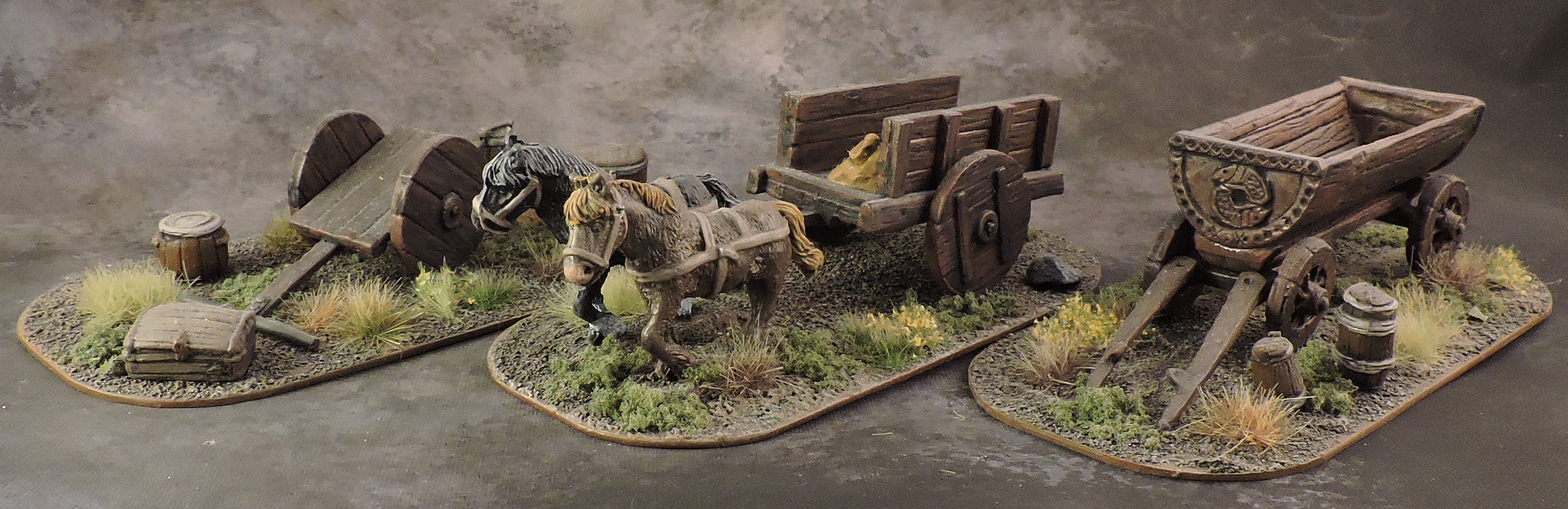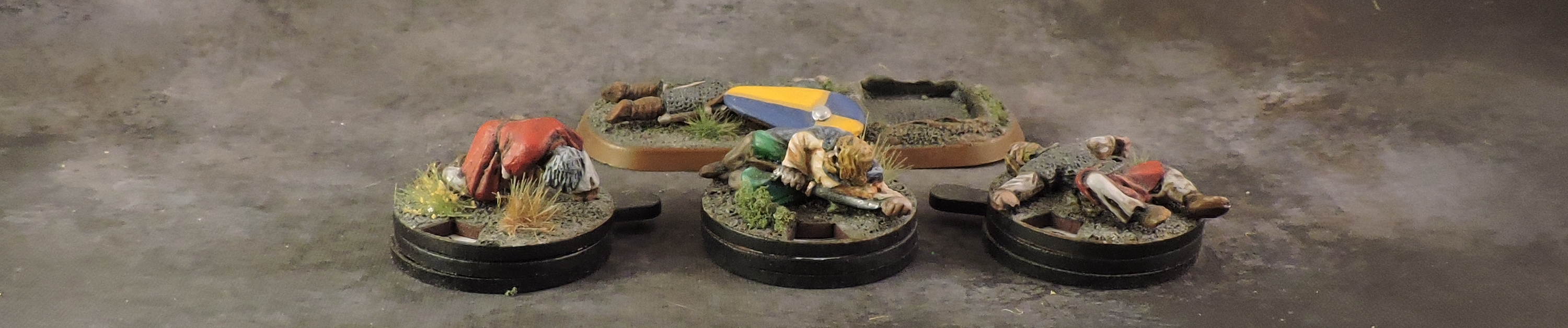 SAGA mostly uses standard field terrain,. but I painted up some MDF pre-cut houses to give a Dark Age flair as well as a small boat for raiding scenarios. SAGA also heavily relies on counters which, to be more visually attractive, are made from bases with little counter-wheels in them and figures on top. The little raven markers serve to indicate unit fatigue.