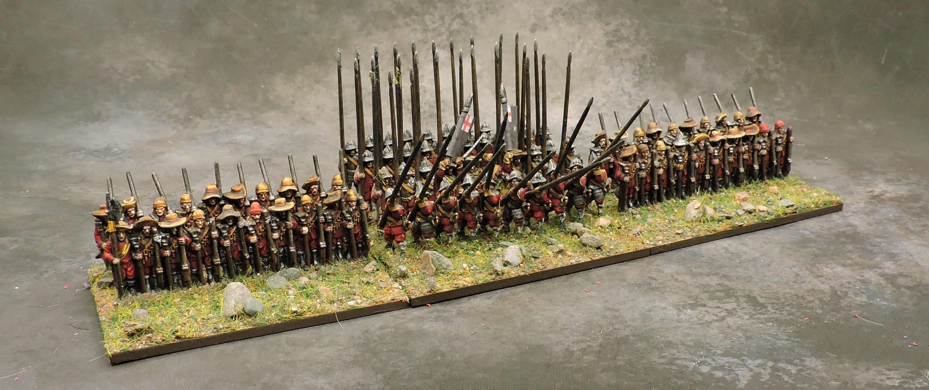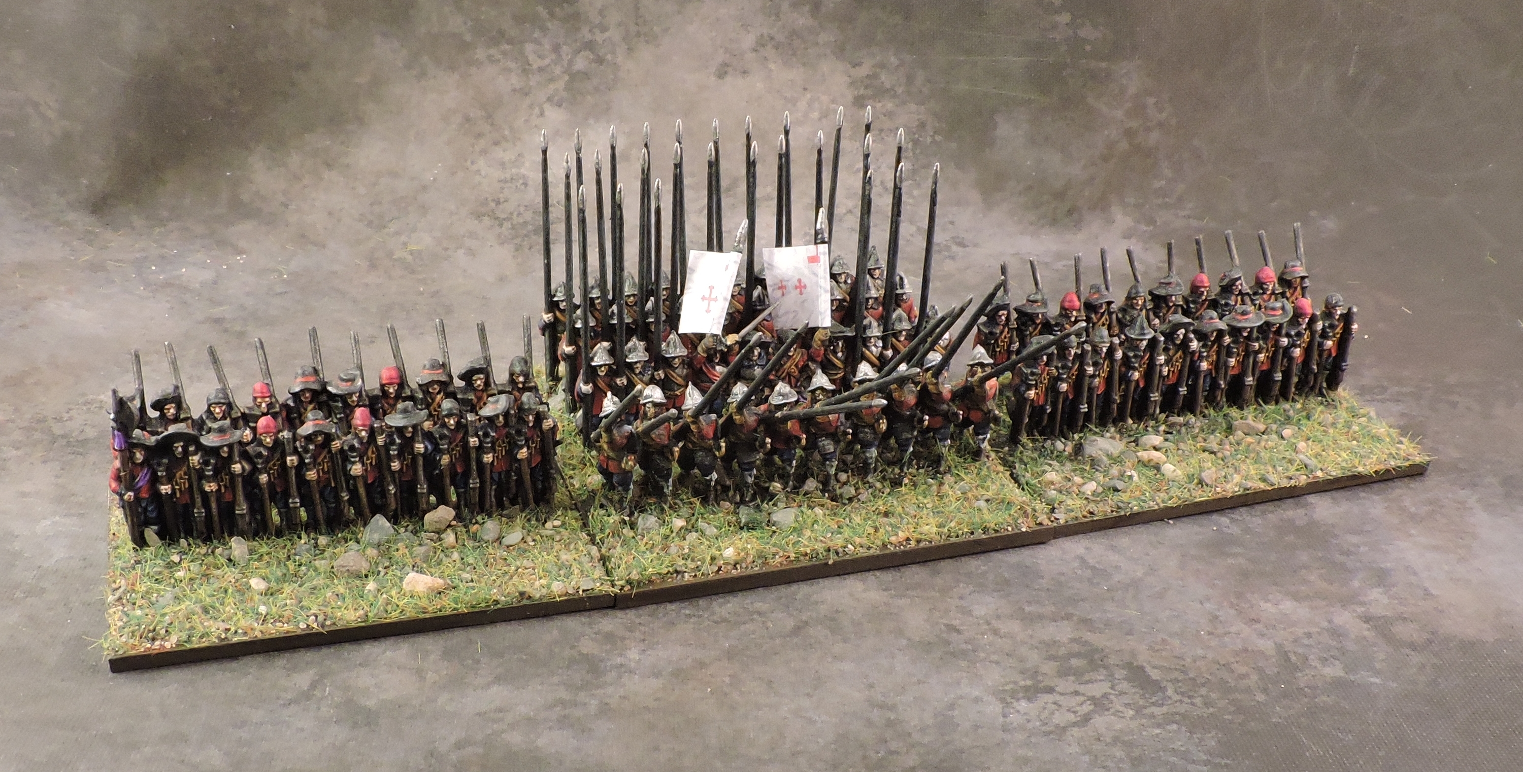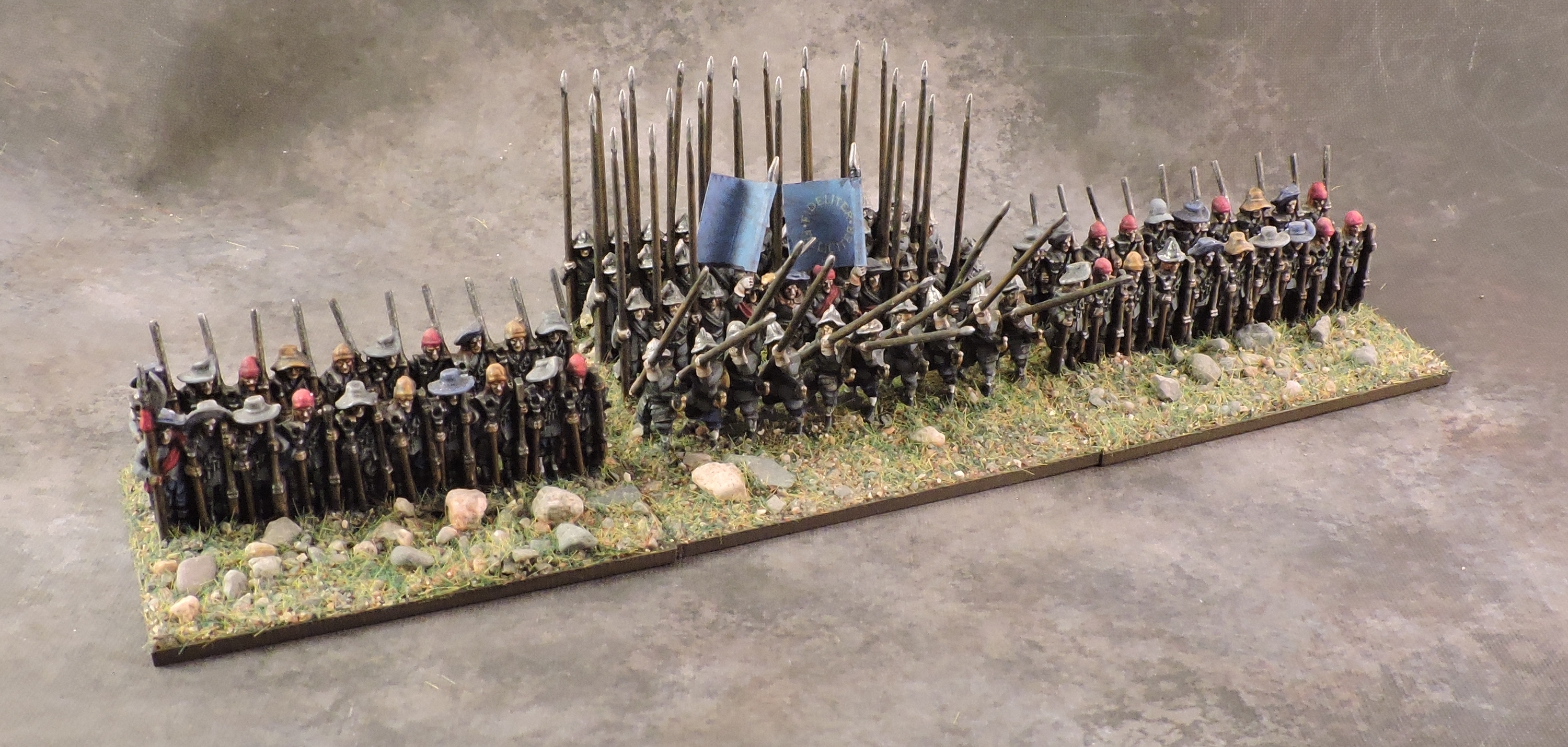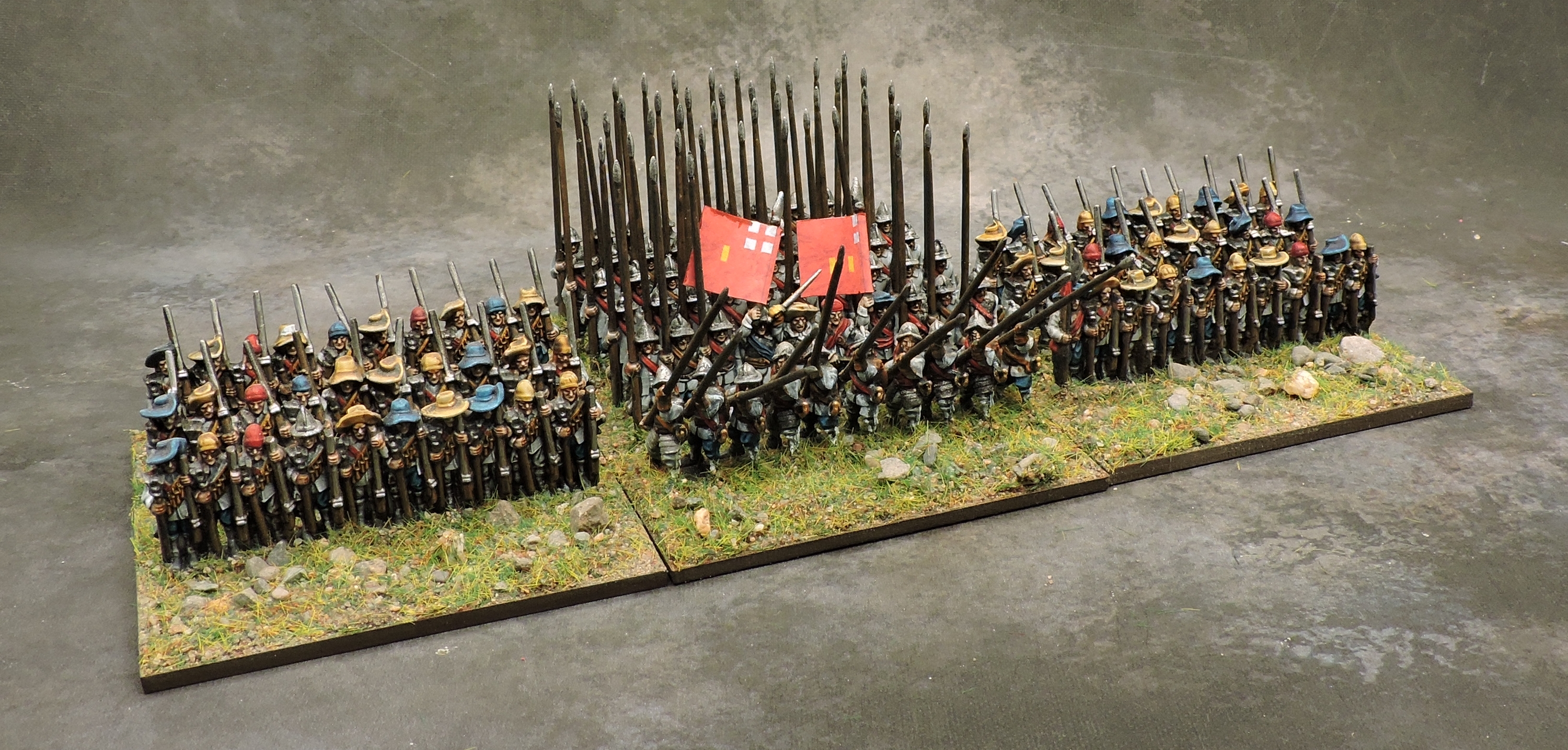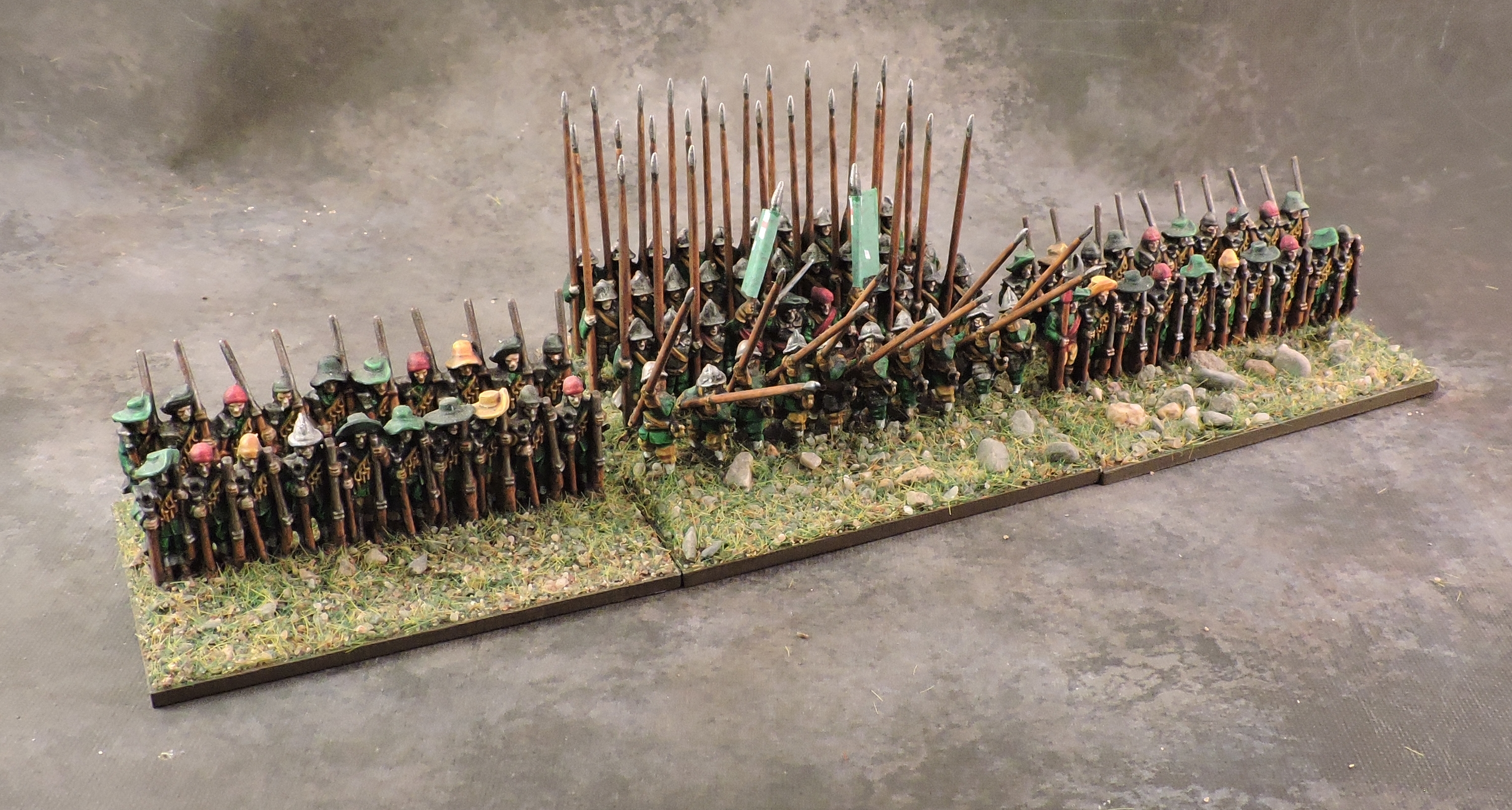 - Small Regiment of Foot: Two small musketeer bases (30x40mm) flanking a 60x40mm pike base with two strips. Represents a small regiment of ~400 troops in 5 or fewer companies.