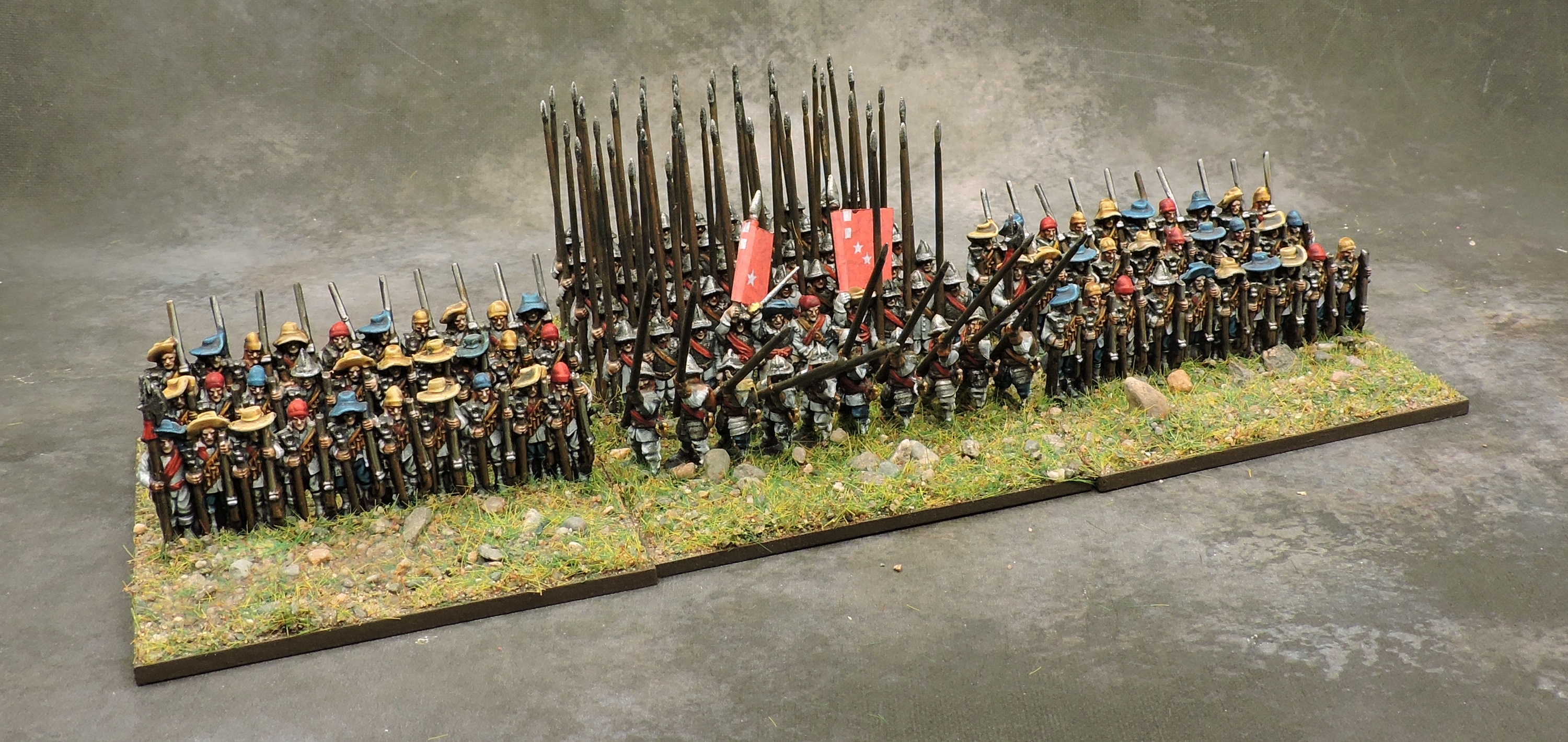- Standard Regiment of Foot: Two musketeer bases (60x40mm, 2 strips) flanking a 60x60mm pike base with four strips. Represents a typical regiment of ~800 troops in 8-10 companies.