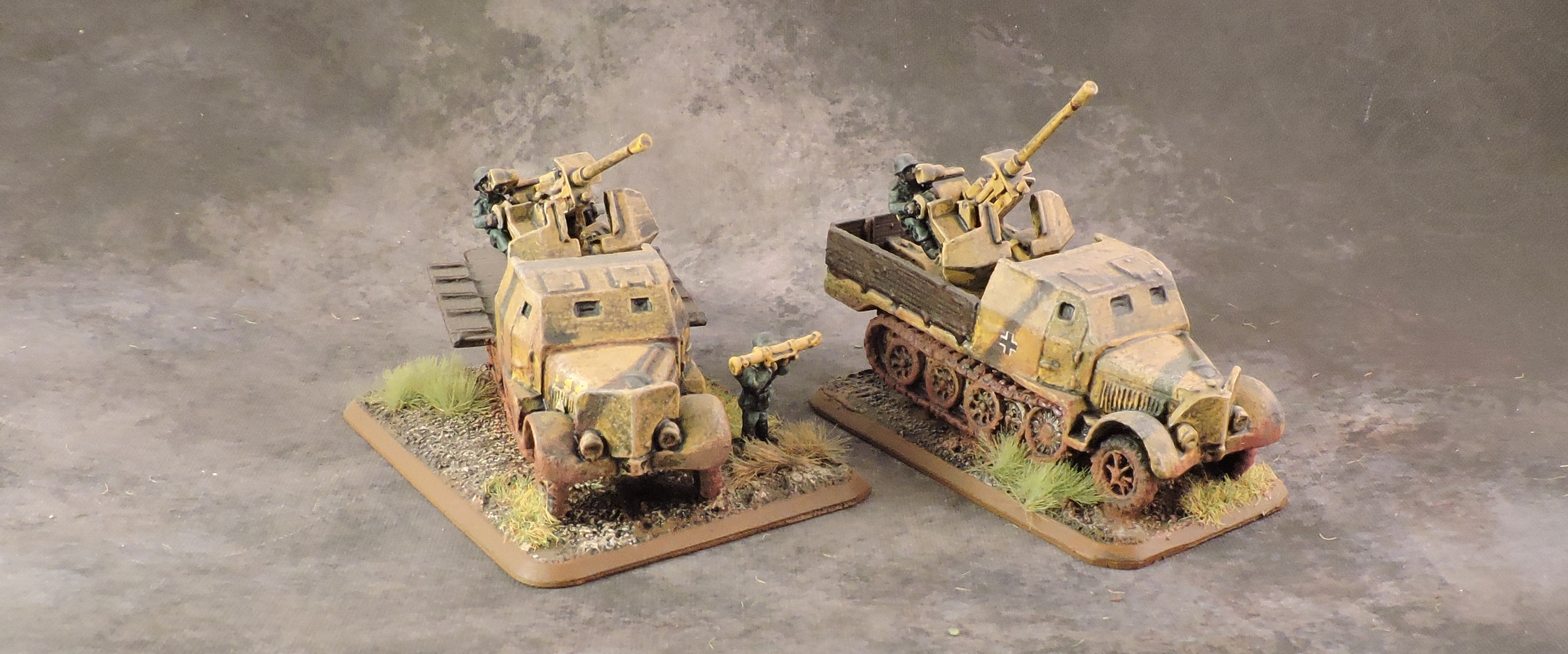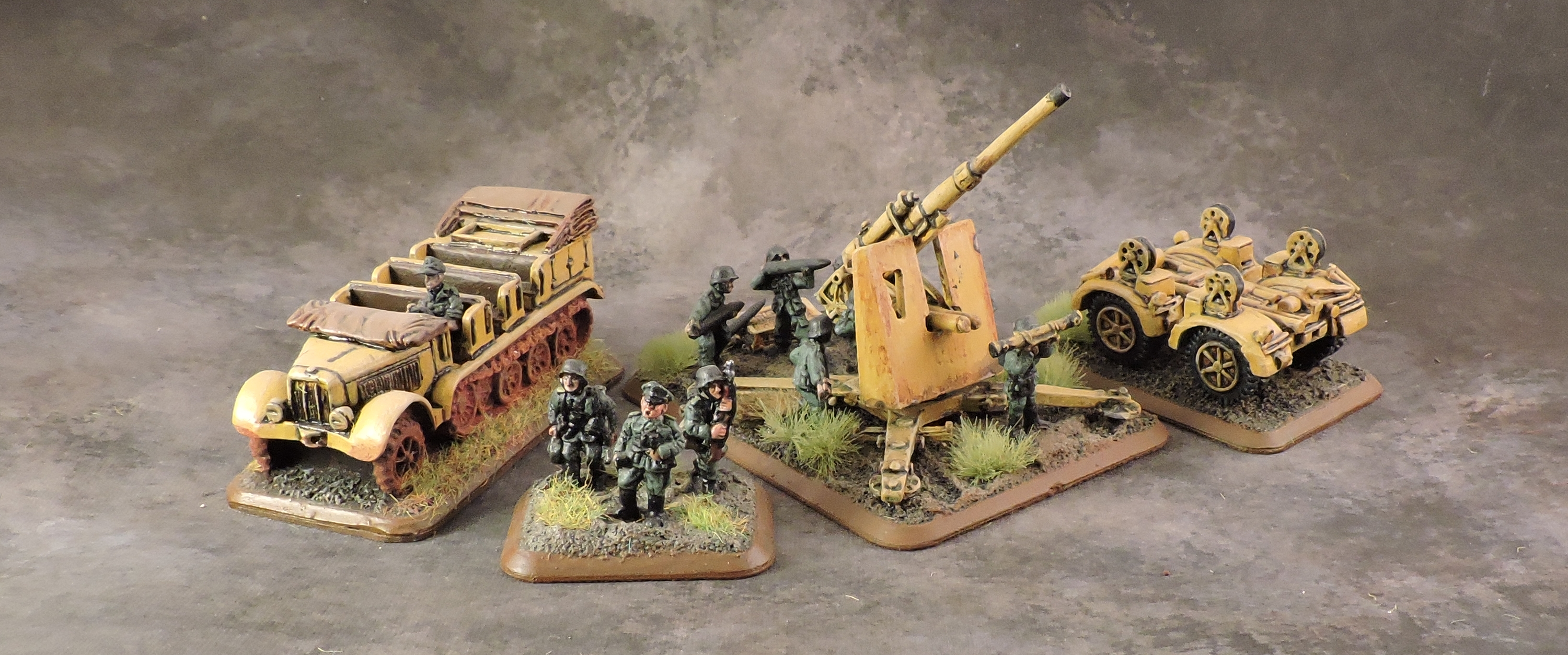 Anti-Air Sections: Two Sd Kfz 7/2 with armoured cabs provide mobile AA protection. A single 8.8cm FlaK36 with command provides static AA.