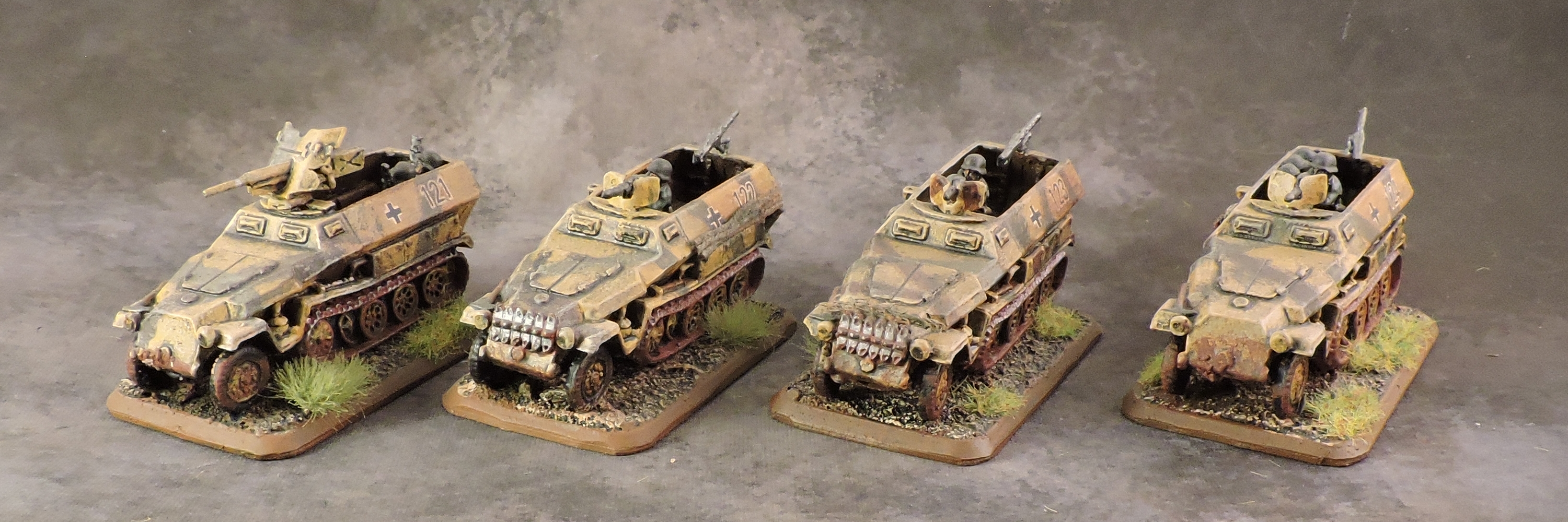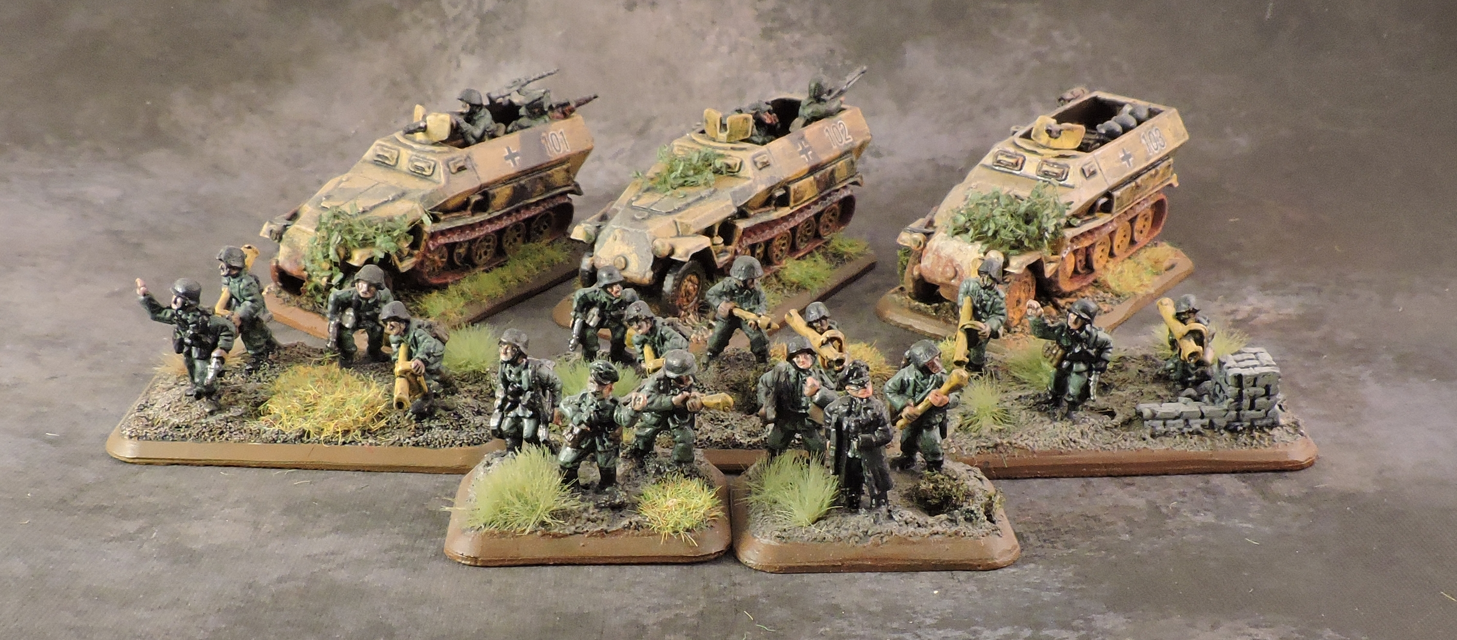 4th (Heavy) Platoon: The heavy platoon can operate in an armoured or infantry configuration. It includes a full HMG section, a full mortar section and an armoured mortar section with a command Sd Kfz 251/1c and two Sd Kfz 251/2c. All three sections have a command team. The regular mortar section has three observers and the armoured mortar section has a single observer with Kuebelwagen. The platoon can be fielded as a single Heavy Platoon or as individual mortar and HMG groups.