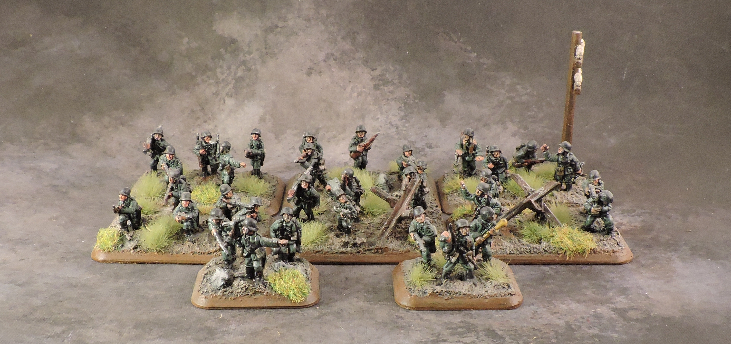 I also included two sets of additional bases which could be added to any of the three Grenadier platoons to cover more specialized lists. Each platoon can be augmented with two additional Rifle Teams for an 8 team Rifle/MG Grenadier platoon. Alternatively, a group of 5 MG teams with Panzerfaust can be distributed among the three Grenadier platoons if they are fielded in a 78th Sturmdivision company list.