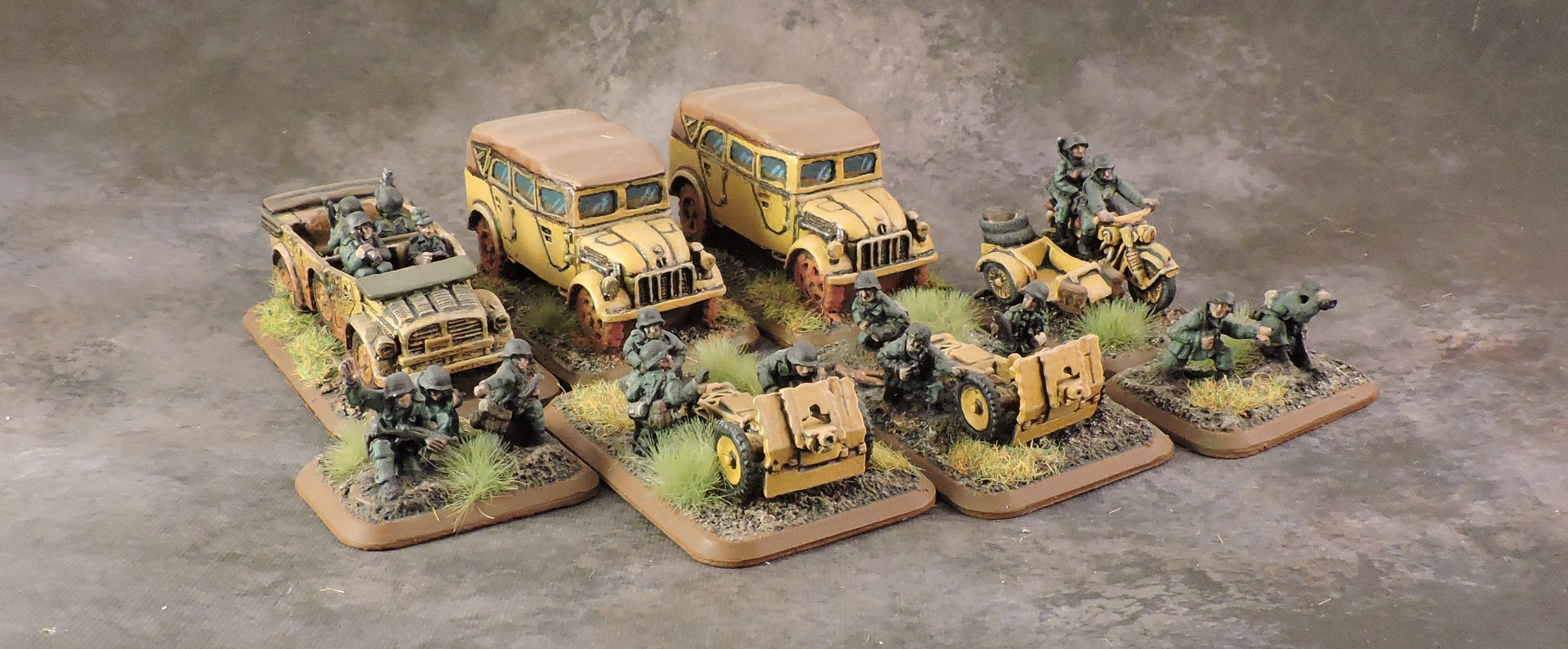 Infantry Gun Sections: Light artillery units are designed to provide basic support fire for the main troop formations. For this I have a 7.5cm leIG18 section with command and observer. The section has full transportation with Kfz 70 trucks, a Kfz 15 for the command unit and a motorcycle for the observer. Since leIG18’s are relatively short ranged compared to other artillery, I added the transports for some mobility.
