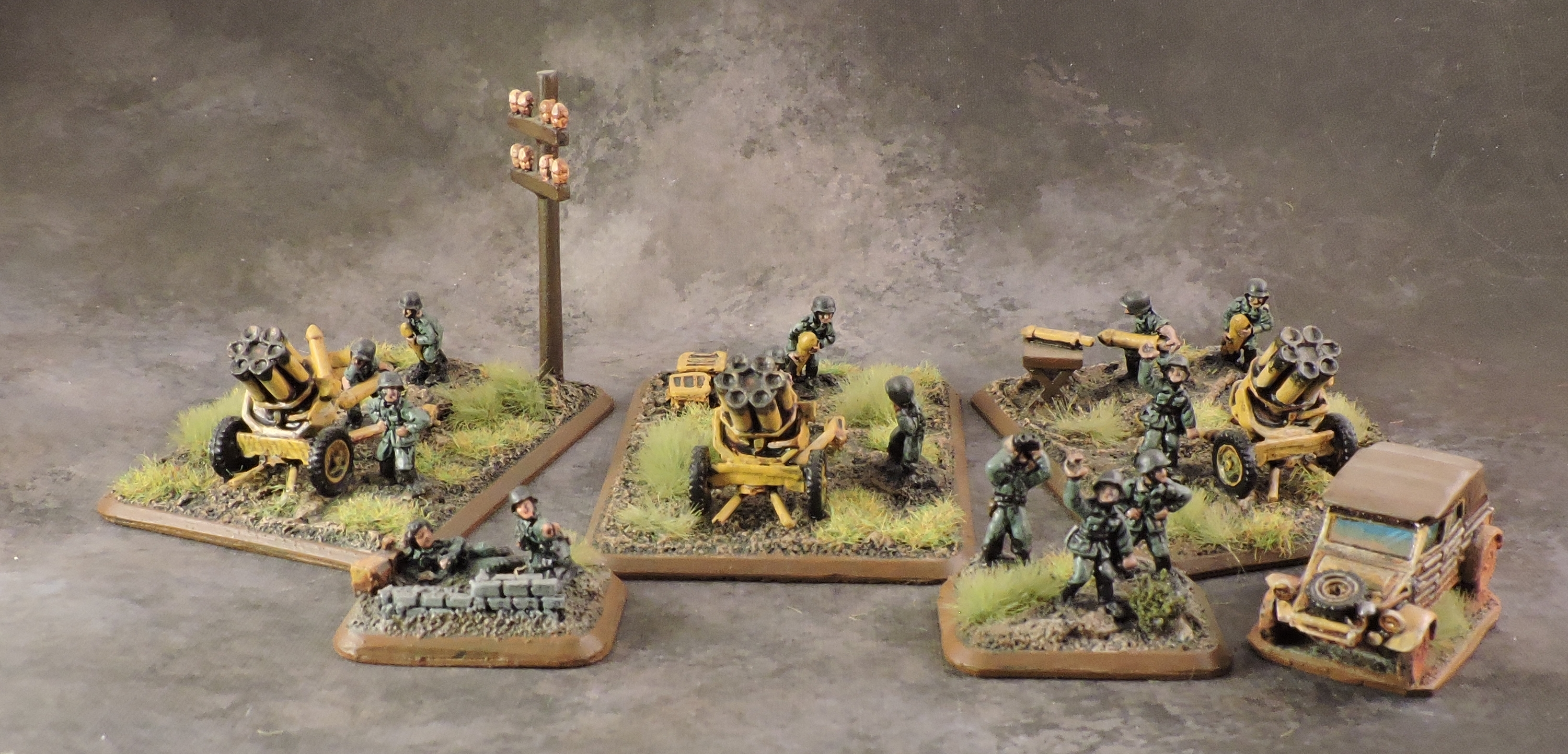 Rocket Launcher Battery: The other artillery option is a single section of Nebelwerfer with command and observer. The observer has a Kuebelwagen.