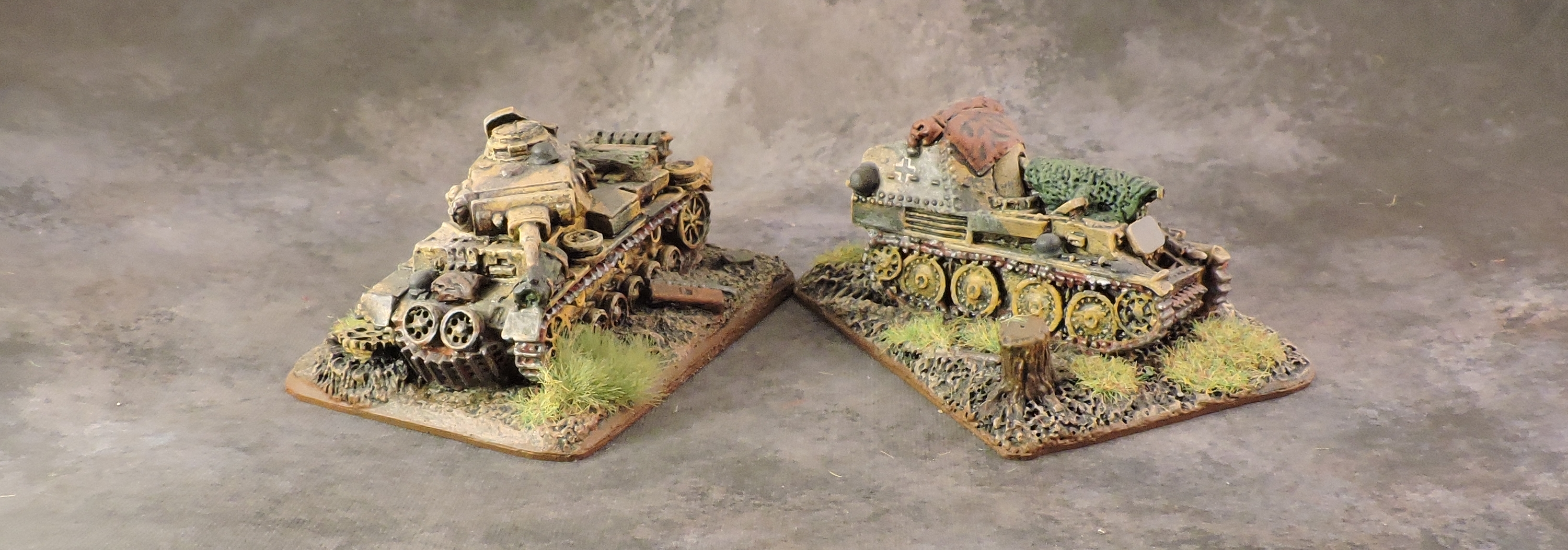 Other: I am a firm believer in the visual appeal of wargaming. That’s why we go through all the effort of painting, converting and terrain buildings after all. I therefore dislike the use of counters or dice on the battlefield to identify game dynamics. On the other hand, Flames of War requires a number of game play markers so I made up visually pleasing alternatives. The destroyed Panzer III and Marder are normal objective markets.