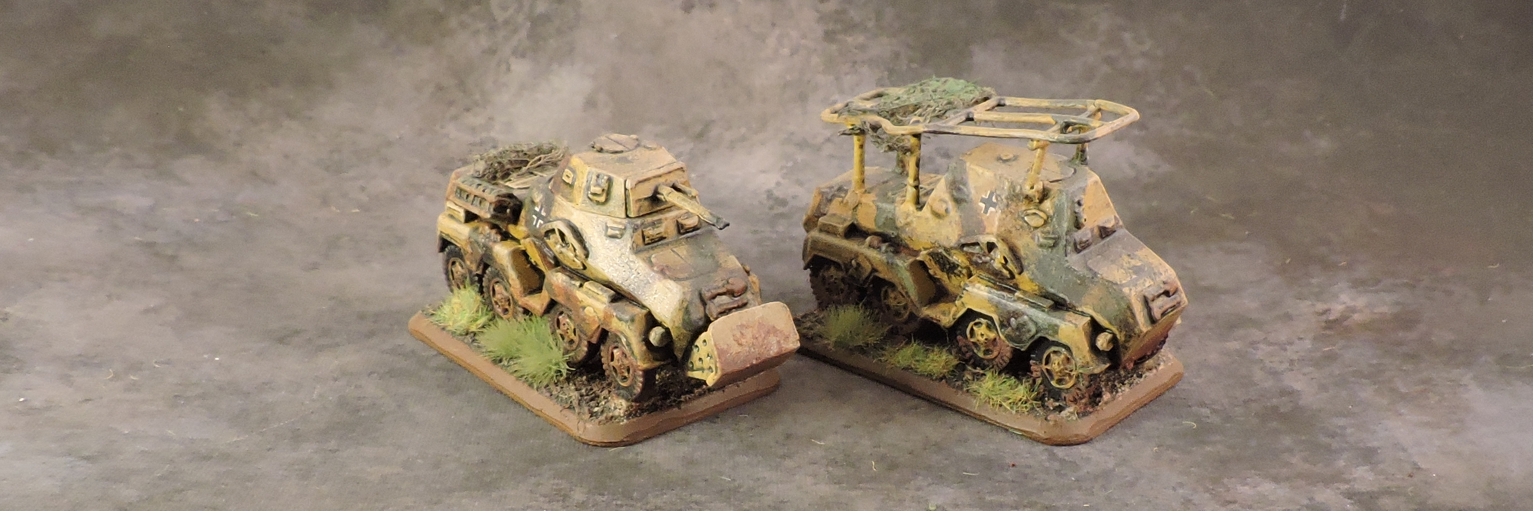 Recon Vehicles: A small armoured car platoon with a Sd Kfz 231 and a Sd Kfz 263. The Sd Kfz 263 radio variant counts as a normal Sd Kfz 231. I just like the look of the radio version.