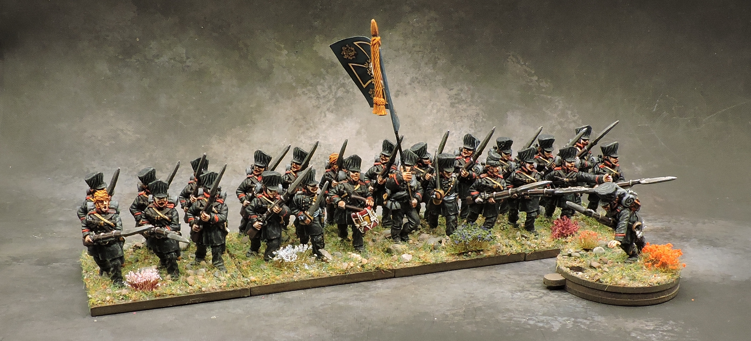 This regiment, led by Major von Petersdorff, was the reformed Lützow Legion in their unique black uniforms. Despite being under-equipped, badly trained, and frankly a rag-tag formation, the regiment stormed Plancenoit with elan and ejected the Imperial Guard. The Fusiliers battalions was the first Prussian unit to reach the highway behind Plancenoit, sealing the victory. Calpe Miniatures makes a custom range for these. The Legion didn’t carry a flag, but the black cross and eagle seemed appropriate enough to include.