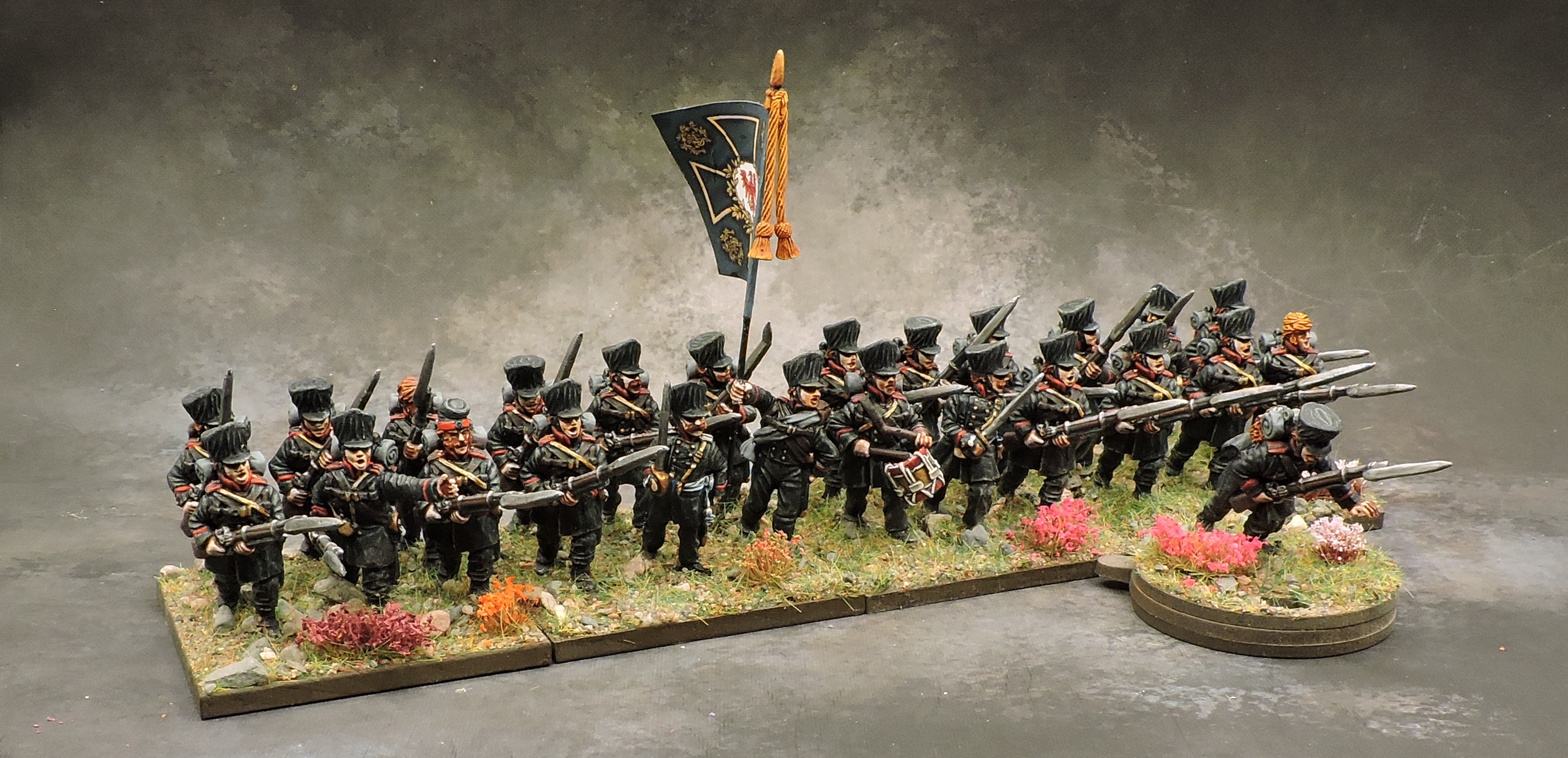 The 18. Infanterie Regiment, led by Oberst von Löbell, suffered over 700 casualties during the bitter fight with the Imperial Guard regiments in Plancenoit. The regiment was formed in 1813 as the 6. Reserve Regiment with its battalions drawn from I/1st West Prussian, II/1st Silesian, and II/2nd West Prussian respectively. In early June 1815 they were designated at the 18th Infantry Regiment and received a first issue of regular uniforms with pink facings. The regiment was still refitting during the battle so I have modelled them in a mix of uniforms. Officers and NCOs wear the new uniforms while most of the rankers are still in their old reserve outfits with red (I and Fusilier Battalion) or yellow (II Battallion) facings. The regiment didn’t carry a flag at Waterloo but I added a West Prussian reserve flag nevertheless.