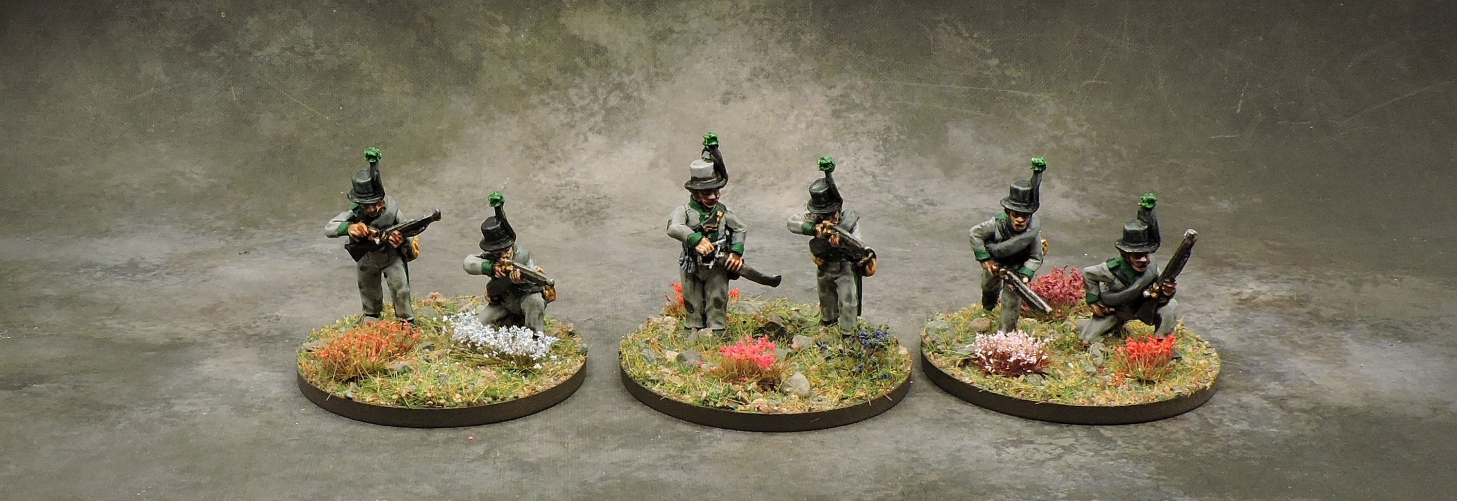 5. Jäger: Most Prussian regiments had special Jäger light infantry units attached. These were typically Landwehr members who, in their daily lives, worked as hunters or similar professions (“Jäger” meaning “Hunter” in German). I am representing these as skirmish bases attached to each regiment with base count matching the variable unit strength at Waterloo ranging from just a few men to hundreds in dedicated formations. Additionally, each fusilier battalions has three skirmish bases covering the regiment.