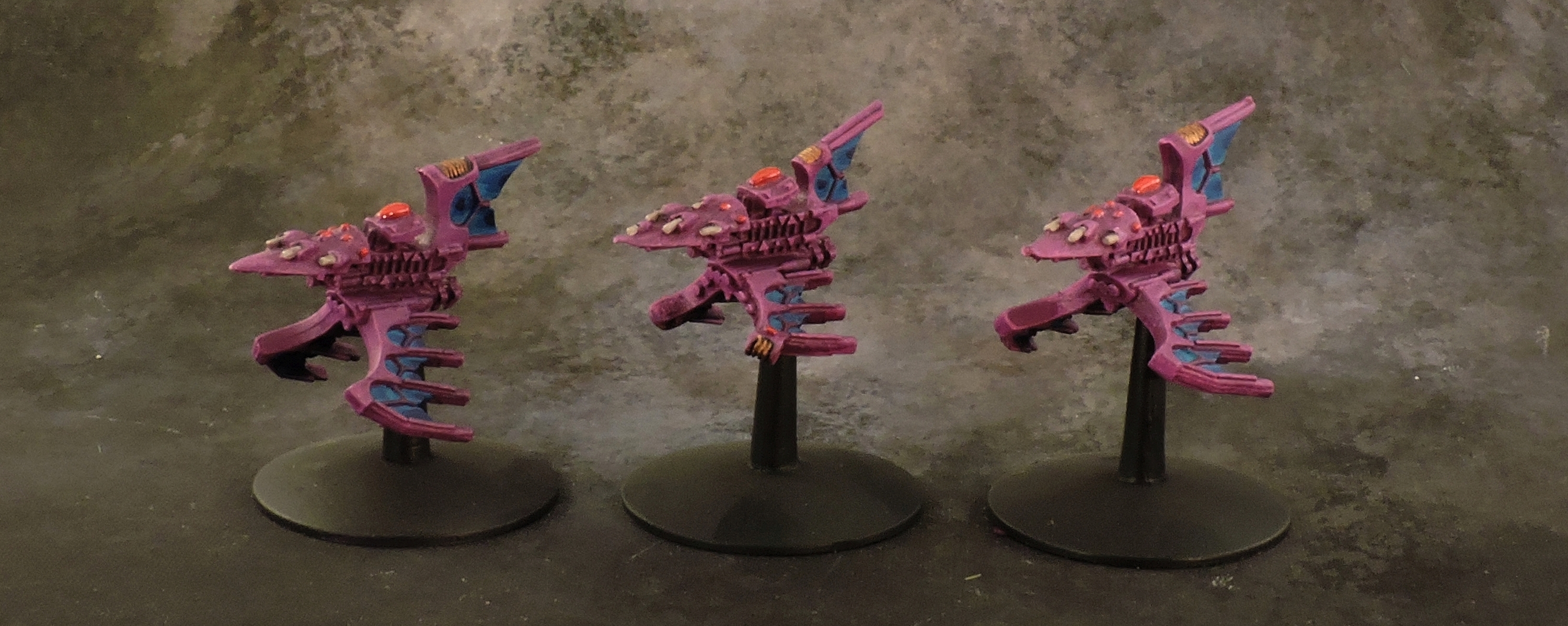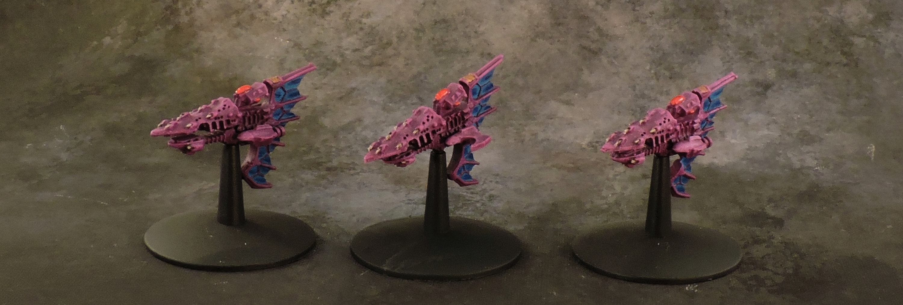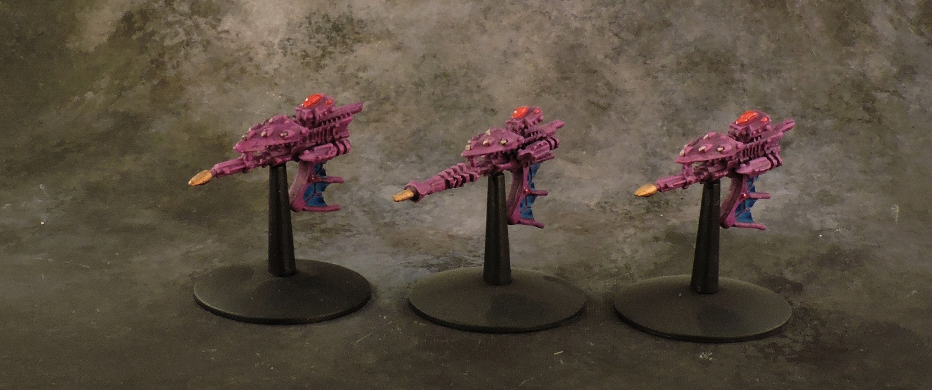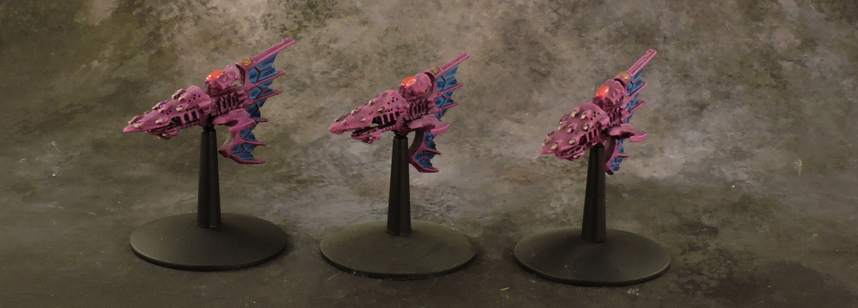 The Eldar came out in two model lines in the early days of BFG. I settled on the classic Craftworld line and, as usual, got everything in the range. The fleet is painted in a similar scheme to my Warhammer 40k Eldar army mainly because I like purple…