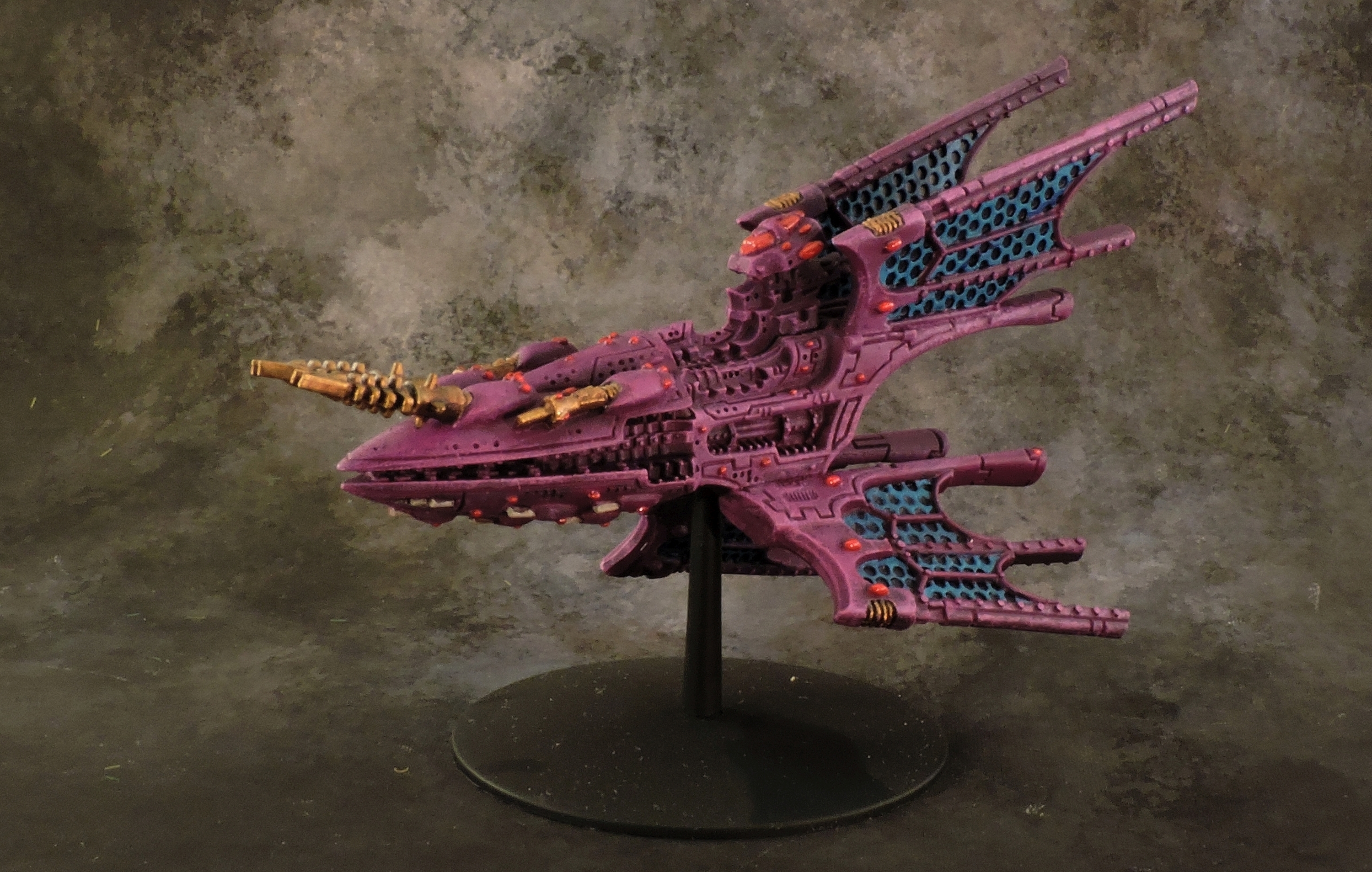 Battleships: The Void Stalker is the only battleship available to the Eldar, but it’s a good one. My model lost its forward guns at some point during its long storage in the “unpainted” bin. I replaced them with the tip of Warhammer 40,000 Falcon sensor poles which blend in nicely.