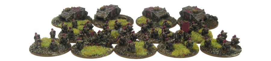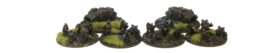 Iron Warrior Retinues: The core of the faction force are two retinues including extra bases for all optional character upgrades (lord, sorcerer and champion). Both retinues have a full complement of Havocs and Rhinos for transportation. The Iron Warriors are the least visibly warped of the chaos warbands so most of the equipment is similar to their imperial counterparts. The paint scheme is Boltgun Metal, black detailing, yellow safety strips and a Devlan Mud wash over everything. The Rhinos are custom design from the talented online modeller “Nik”. They are colour-coded red and purple for the two retinues, with a gold top door chaos star for the Rhino of the character and black stars for the Havocs.