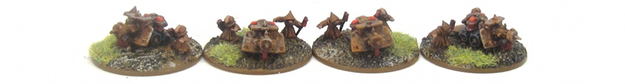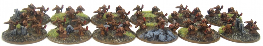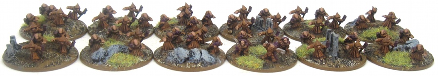 Iron Cult: The Iron Cult is formed from the pathetic servant creatures of the Iron Warriors. They roam the vast Iron Warrior forge worlds, collect scrap metal and serve as labour pool as needed. In game terms they are my Lost and the Damned Undivided faction. Like the Black Legion Iron Warriors, I themed the Lost and the Damned Undivided list around machinery. The Iron Cult is just a bit rustier than the polished machines of the Iron Warriors. The core of the Iron Cult are three Cultist Covens with full fire support each. The figures are DRM Ketzali and the paint scheme is inspired by the Starwars Jawa’s who have similar rust scavenger look. I colour-coded their staff icons in the same colours used for the Iron Warrior retinues (red, purple. green). The leaders came from a special Ketzali bodyguard pack. The fire support upgrades are more Ketzali figures with old Ork guns painted up to look like rusted piles of junk.