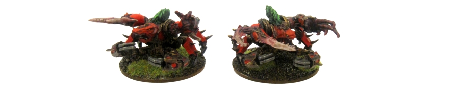 Daemonic Walker: The dedicated World Eater lists have introduced a number of daemonic walkers to Epic based on the more recent Warhammer 40k Chaos units. All of these figures are custom sculpts from artists on the Tactical Commands forum: Two Greater Brass Scorpions, four Blood Slaughterers (both from the same sculptor as the bikes) and two Soulgrinder (“Otterware” Defiler with the addition of some 40k parts and Green Stuff to “possess” them). I also added three Dreadnoughts with minor conversions.