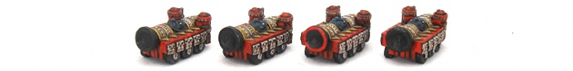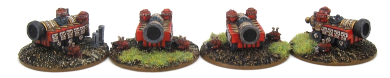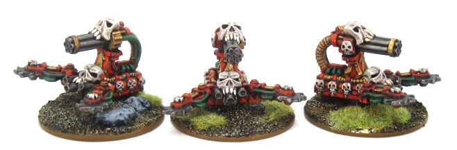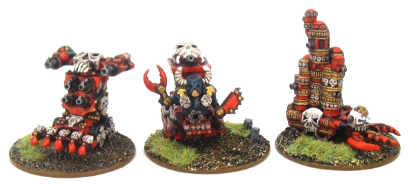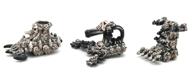 Daemon Engines: Daemon engines were one of the original icons in the Epic game system. Over time I collected at least one of each of the orignal figures and now have enough to field several formations: Three Brass Scorpions, three Cauldrons of Blood, four Doom Blaster, and one Death Dealer, one Tower of Skulls, one Blood Reaper, and four Cannons of Khorne . The Cauldrons of Blood were driled out with a dremel tool and then filled in with water effects tinted with red ink. Where appropriate the other guns where also drilled out. The Cannons of Khorne are crewed by Chaos Squats as a nod to the Warhammer Hell Cannon.