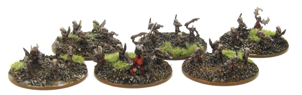 After the wash is dry I go over all the bone areas with several drybrushing steps with Dheneb Stone and later a 1:1 mix of Skull White and Dheneb Stone. I use the cheapo brushes for this as well. The picture below shows some figures after the wash and initial Dheneb Stone drybrush stage.