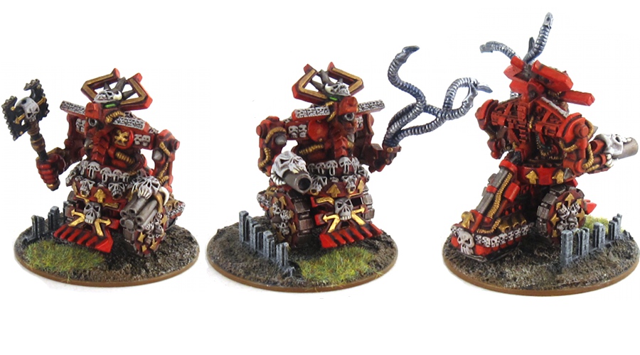 Titans: Khorne has favoured his chosen with two mighty war engines: A Lord of Battle and a Feral Titan. The Lord of Battle is magnetized to mount any of the four weapon options. The Feral Titan is a conversion based on the very old Warhammer 40k Blood Slaughterer figure. The top portion of the figure is converted from an old Juggernaught, various Ork parts and plenty of Green Stuff to remove anything that would suggest a 28mm/40k scale