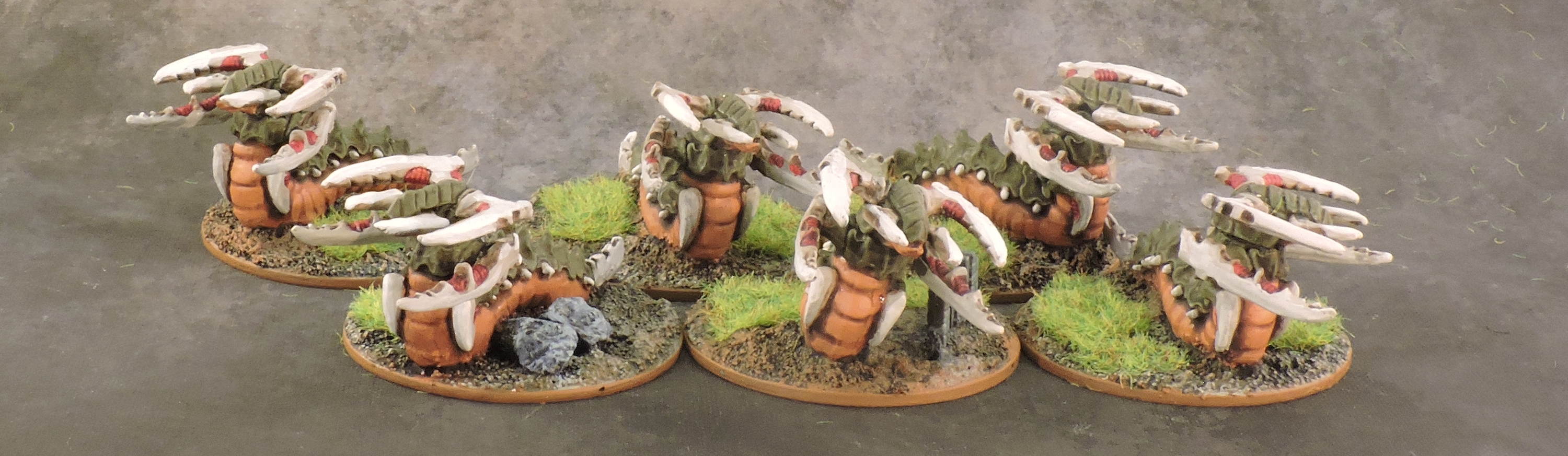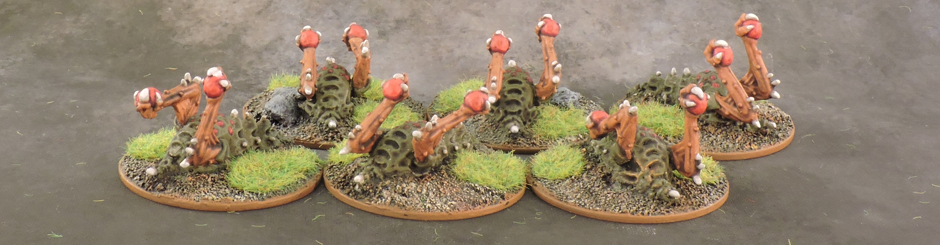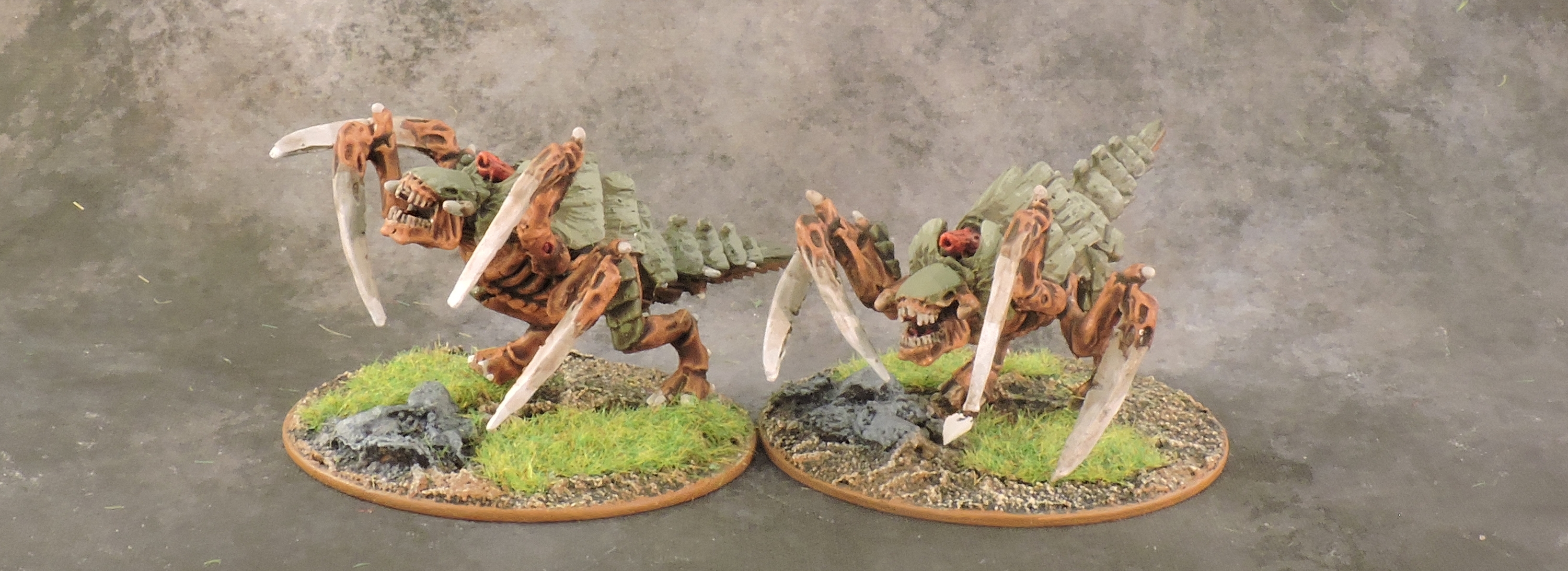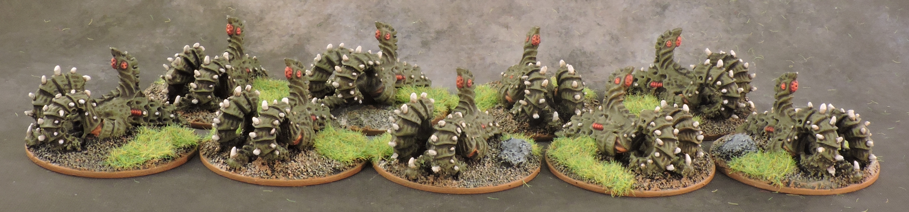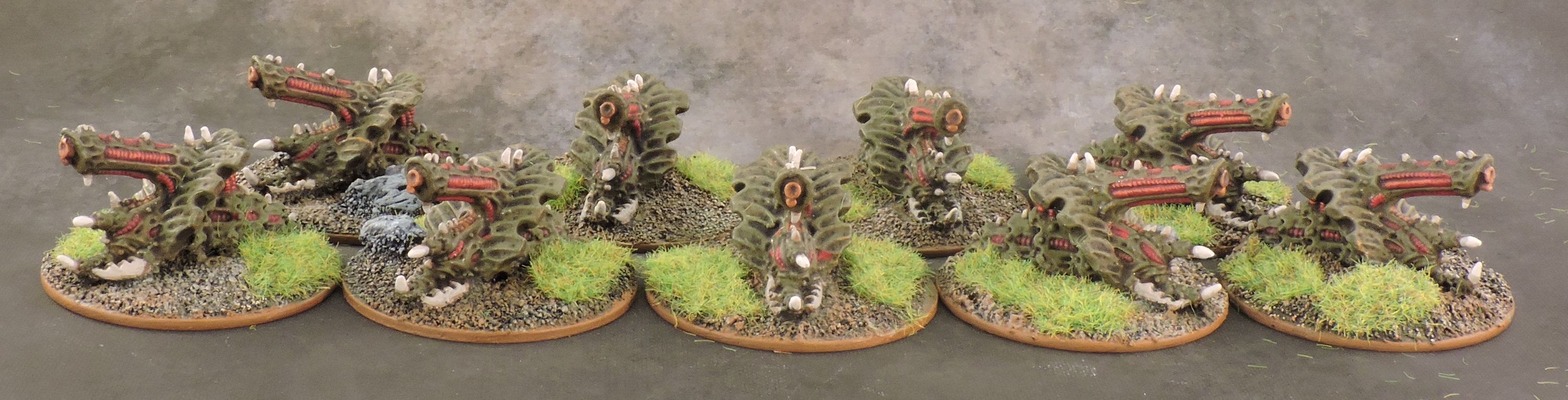 Very Large Critters: The big boys of the swarm come in a variety of shapes. Largest is the Hydraphant which is a small conversion of the Dominatrix. Three Hierophants – including one converted from a 40k Hive Guard – form the main Titan force of the swarm. Two smaller Hierodules function as poor man’s Titans. The figures are from a sculptor found on the TacComs forum many years ago. Finally we have a little blood pond thing as an objective.