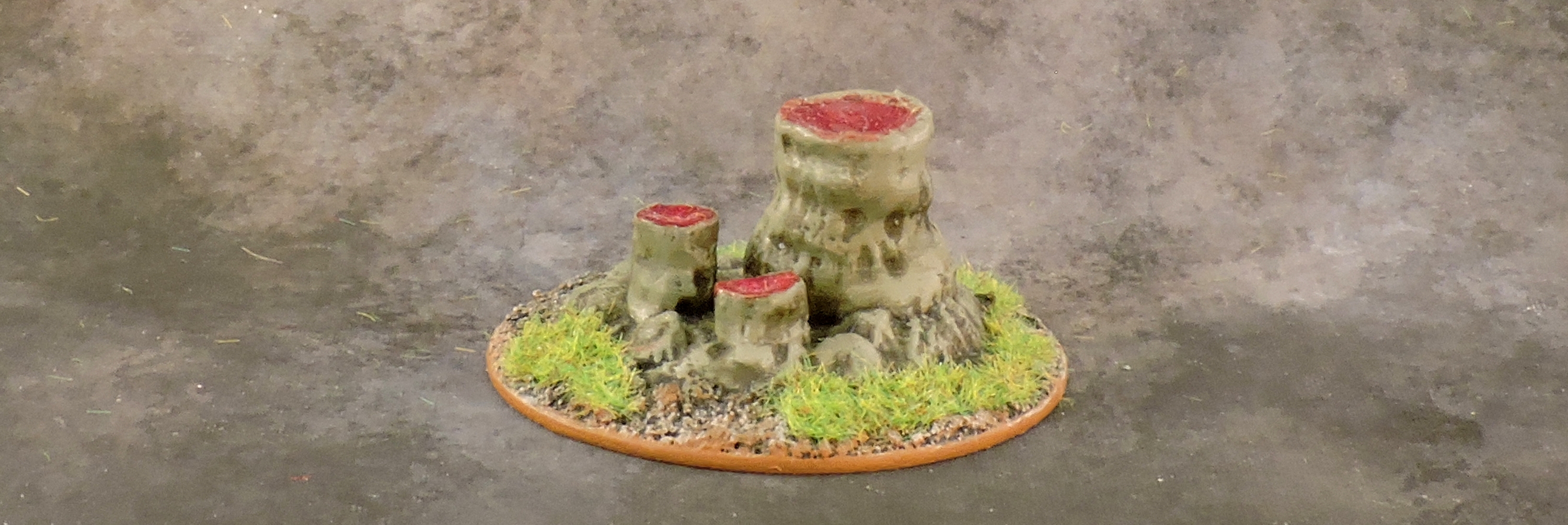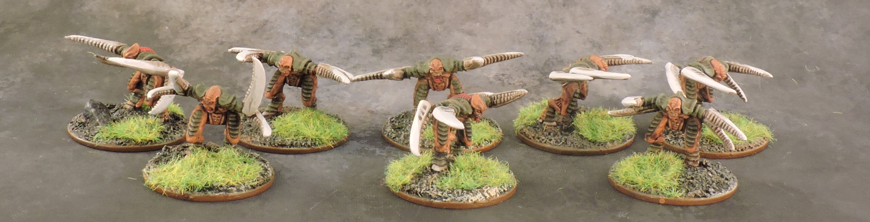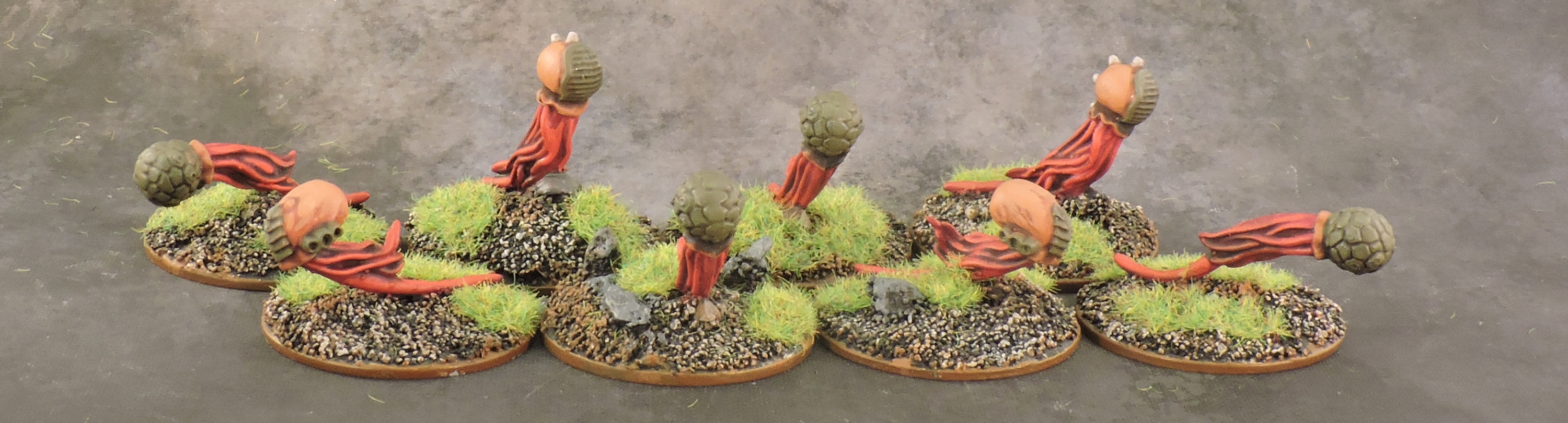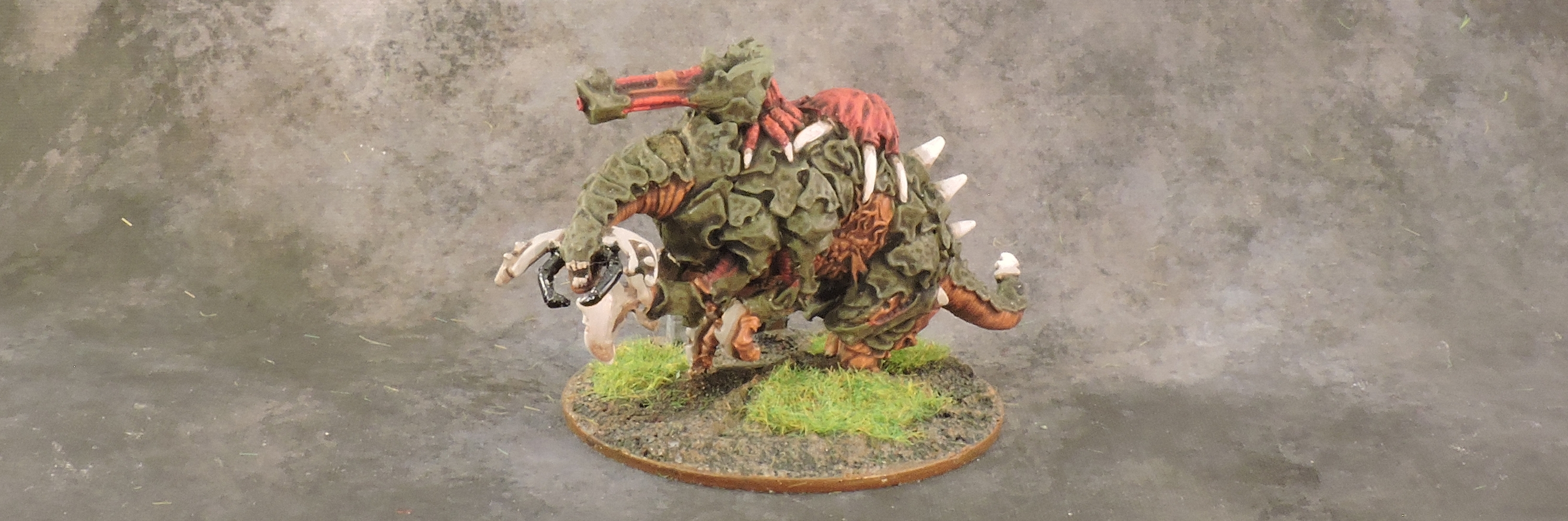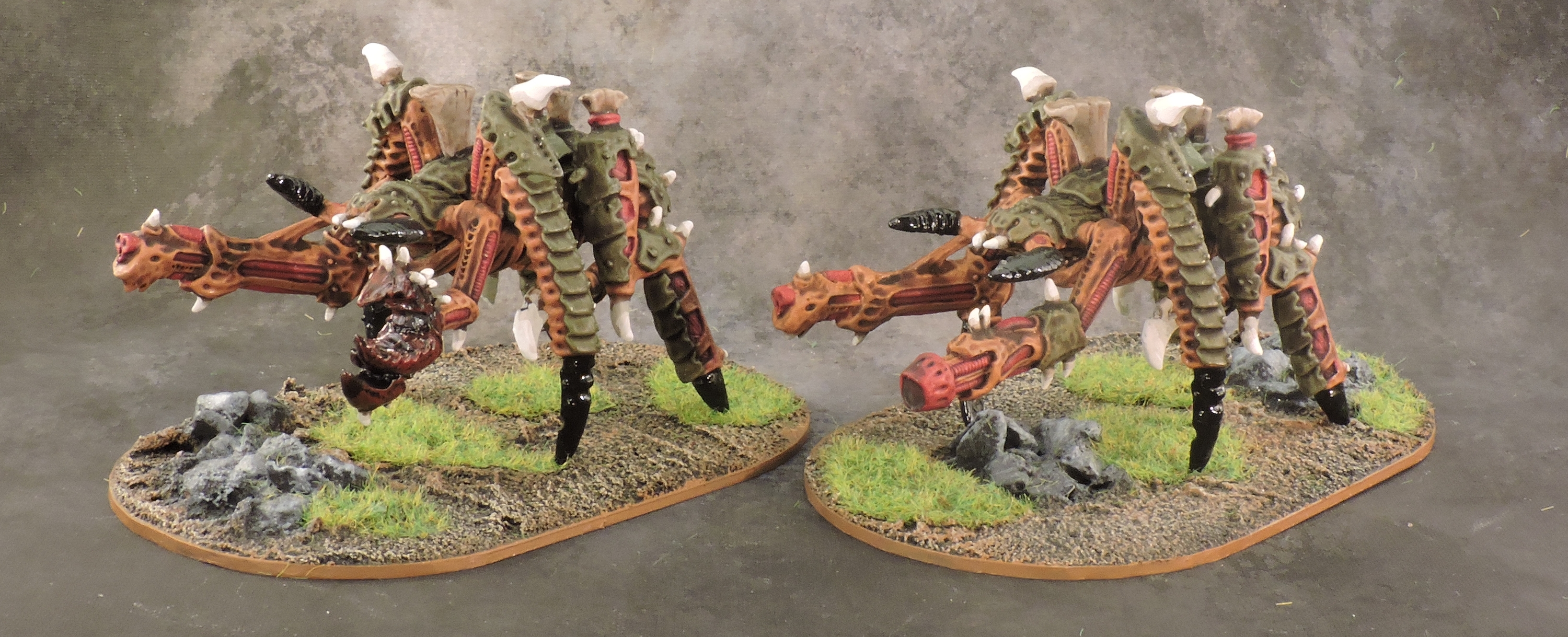 Very Large Critters: The big boys of the swarm come in a variety of shapes. Largest is the Hydraphant which is a small conversion of the Dominatrix. Three Hierophants – including one converted from a 40k Hive Guard – form the main Titan force of the swarm. Two smaller Hierodules function as poor man’s Titans. The figures are from a sculptor found on the TacComs forum many years ago. Finally we have a little blood pond thing as an objective.
