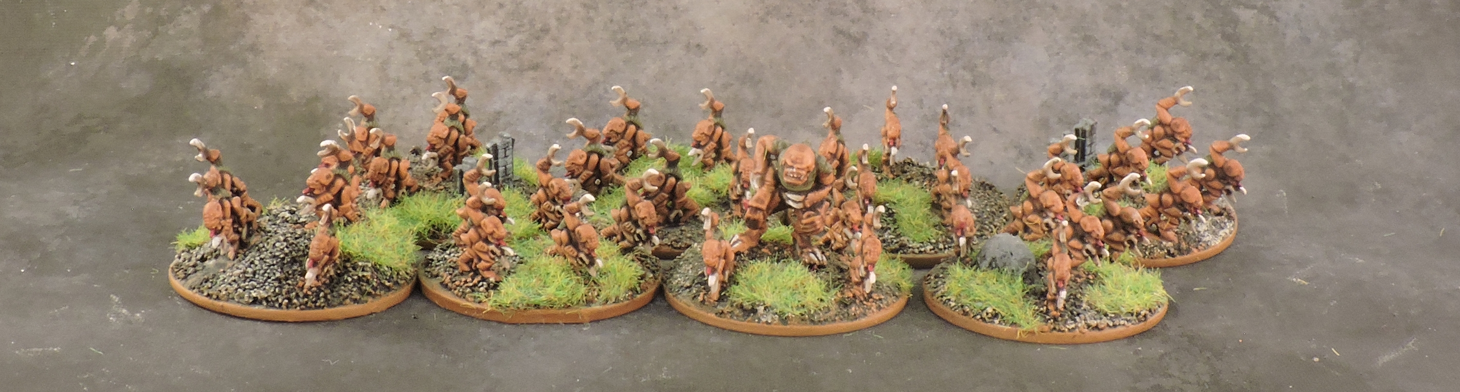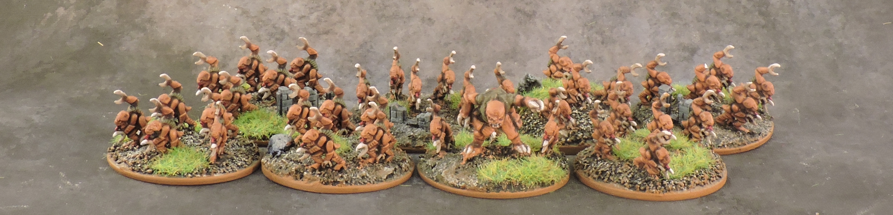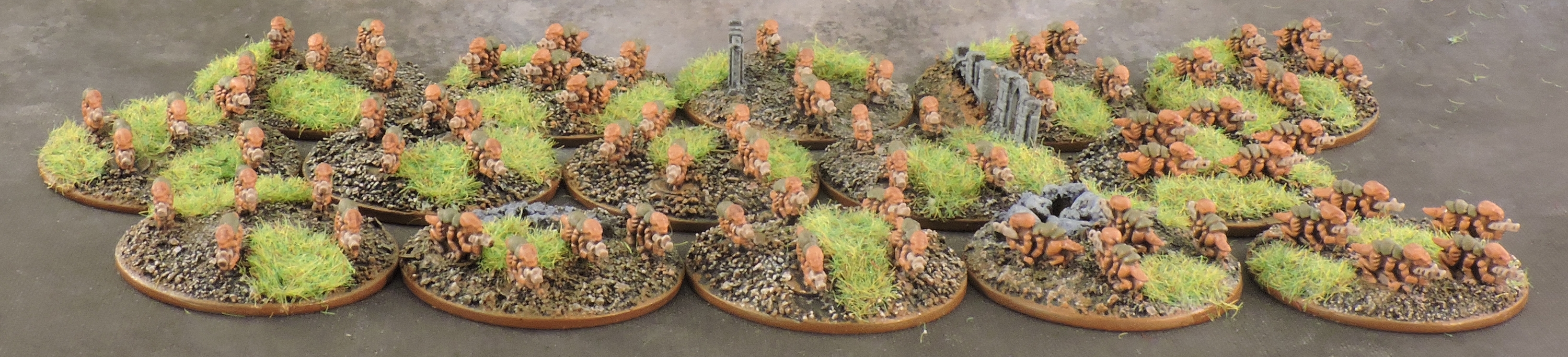 Medium Critters: An assortment of larger creatures follow the swarm. Four Biovores offer long range support. 14 Carnifex – including a few larger ones – provide close combat power. 8 Zoanthropes make up the psychic component of the swarm. 9 Raveners – converted from 40k Ripper Swarms – provide additional shock power.