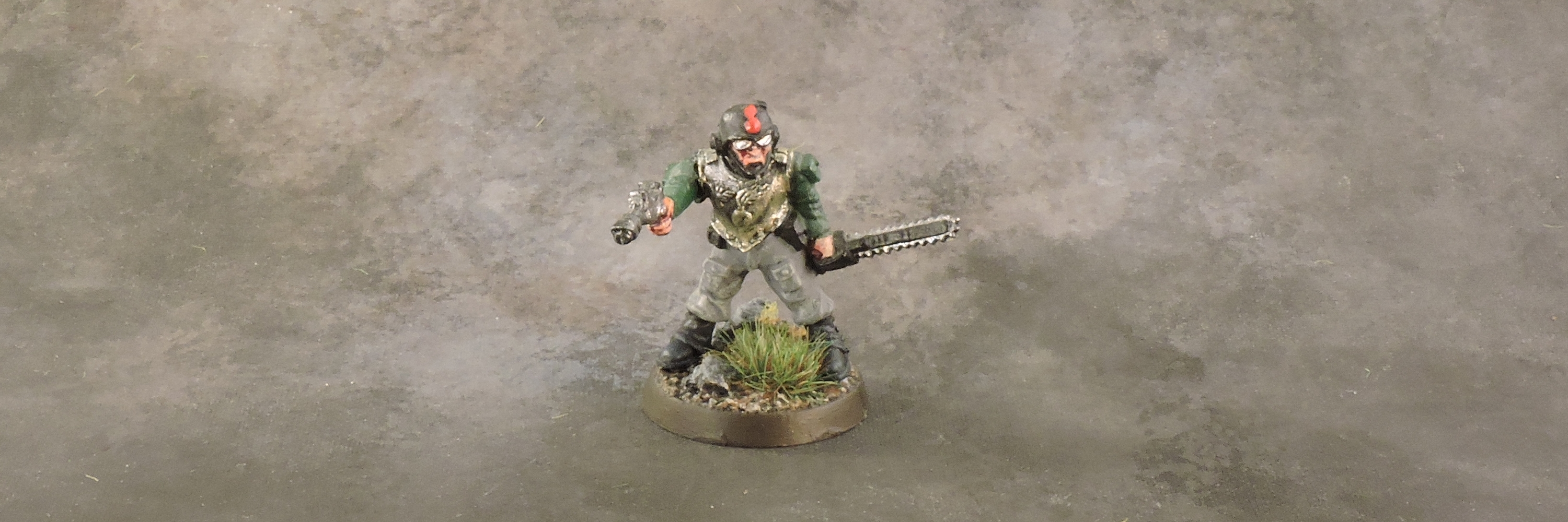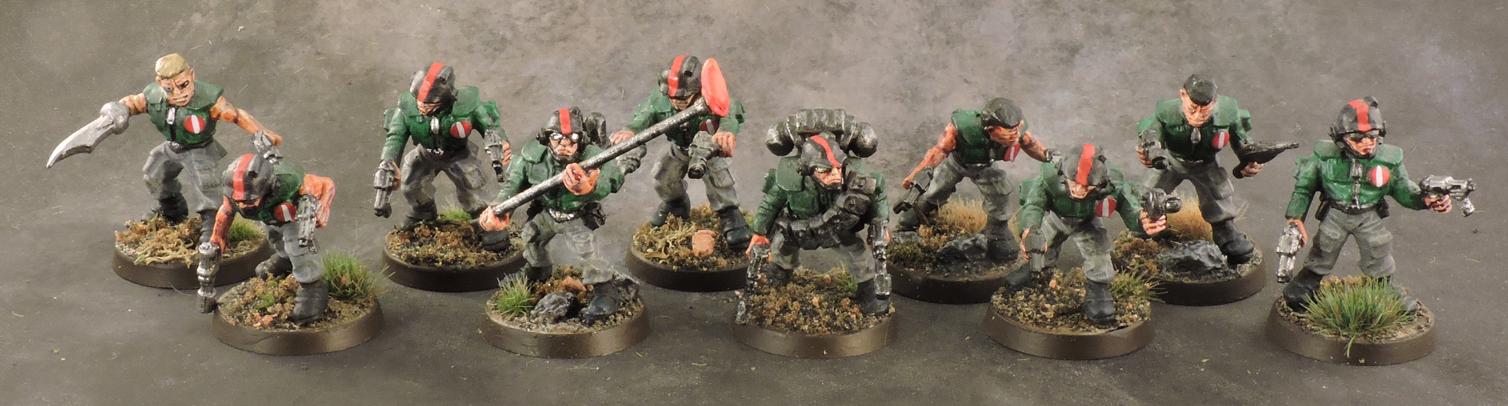 This was my first Warhammer 40k army from a long time ago. The figures are mostly from the Rogue Trader plastic set which was a marvel at the time. The paint job is pretty limited from today’s perspective, but I recently updated the bases – replacing the classic “green sand” look – and now they almost fit into the 21st century (almost)!