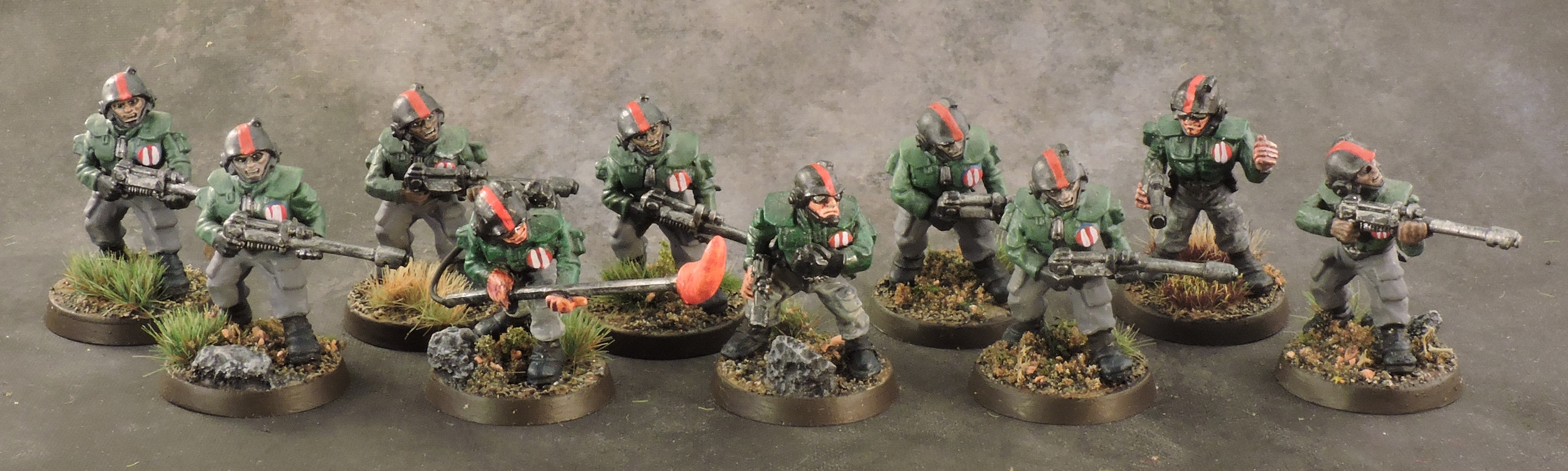 This is the infantry core of an Imperial Guard formation supported by an ancient ArmourCast Baneblade (giant resin figure!). One day, I will paint some more regular tanks to make this reasonably playable under current 40k rules. The formation is broken into a classic platoon-level structure.