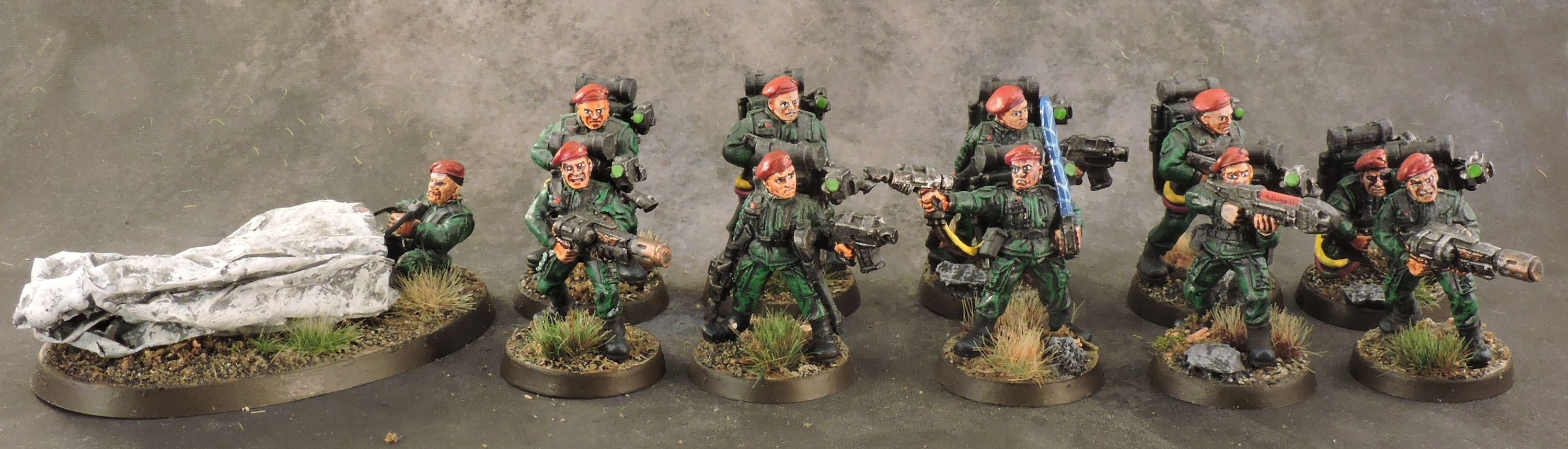 Tactical Platoon: The second platoon – with blue stripes – is a mid-range formation at the center of the Company’s advance. It is led by a Platoon HQ with plasma guns and features two squads with melta guns (metal Cadian figures). Attached to the platoon is a group of Ratling Snipers.