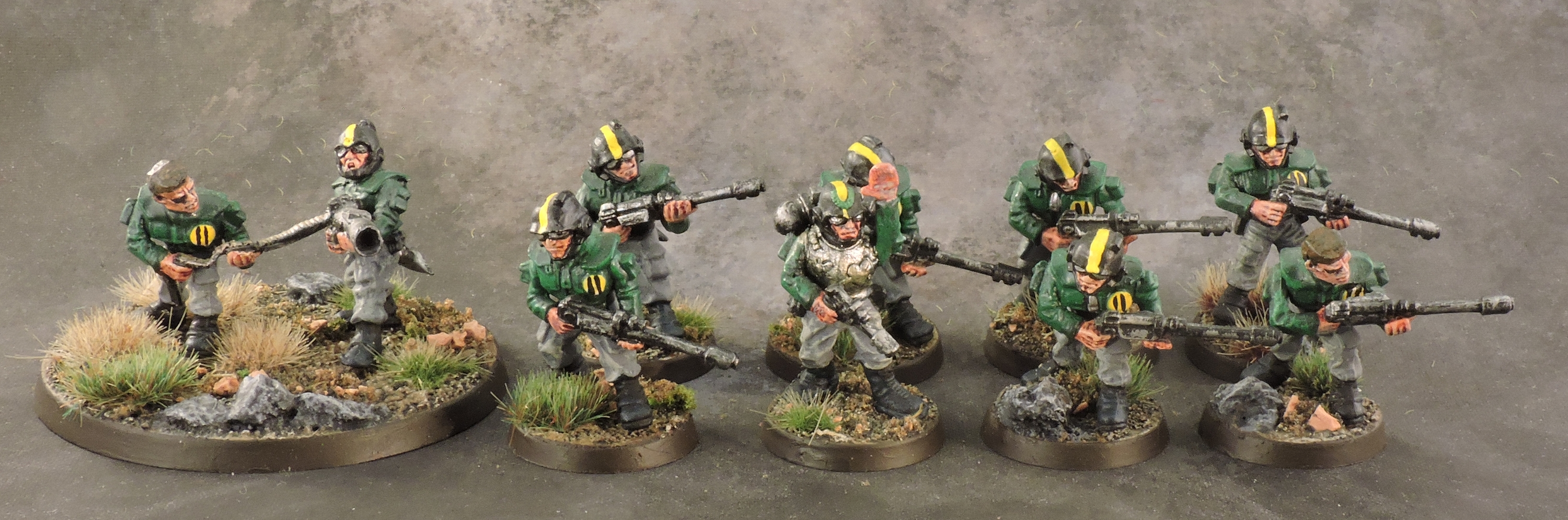 Heavy Support Platoon: The fourth platoon – with green stripes – is the heavy weapon contingent of the Company. It is composed of three Fire Support squads armed with lascannons, missile launchers and mortars (the latter being Cadian metal figures again).
