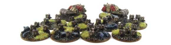 More reinforcements for Papa Nurgle. I added a bunch of Plague Marines to my existing four models. The new models include a Plague Marine Lord. There are only two Rhinos because this really isn’t a legal formation. They can either be fielded as a 4 model “Cult Marine” upgrade for a Black Legion Retinue (with two Rhinos), as a dedicated 7 model Plague Marine formation in the EPIC UK Deathguard list (without Rhinos as that formation can’t have any), or as part of two mixed Plague Marine and Deathguard Marine formations in the TacComs Deathguard list (again without Rhinos). Chaos is confusing…