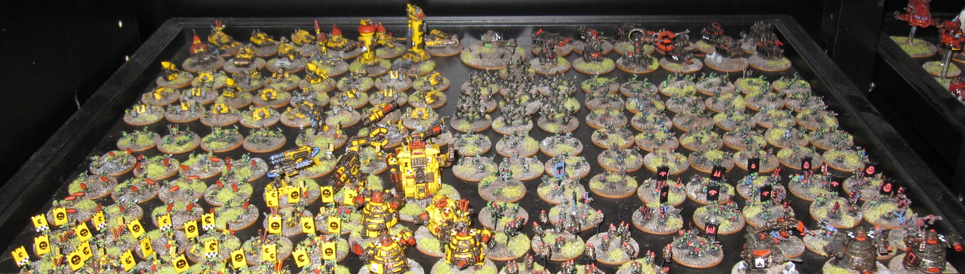 Botom tray, right: Deathskullz Clan with a Huge Mob, Battle Wagons, Stompa Mob with Supa Stompa, a dozen Gun Wagons, Flak Wagons, two Gun Fortresses, a Battle Fortress, Objective and Great Gargant